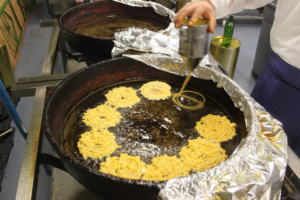 Hassen verse ensuite la pâte dans la friteuse dans un mouvement parfait qui parait très simple et pourtant… Il s’agit d’un vrai métier et il nous le prouve avec brio!