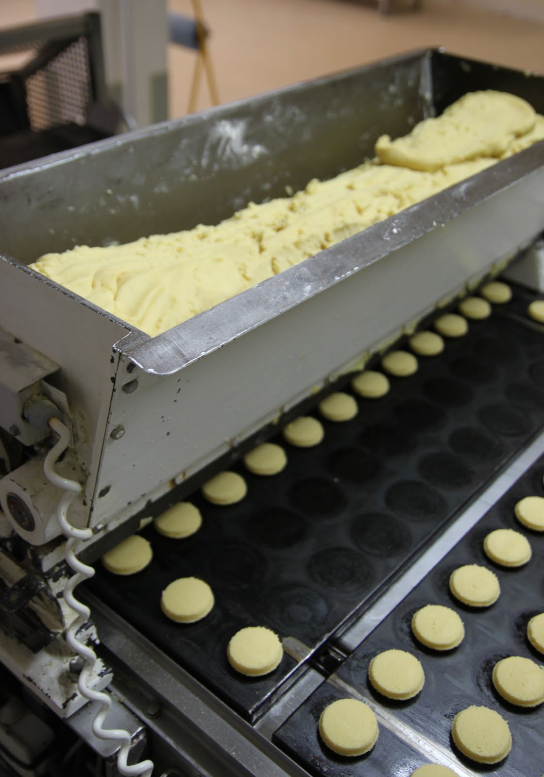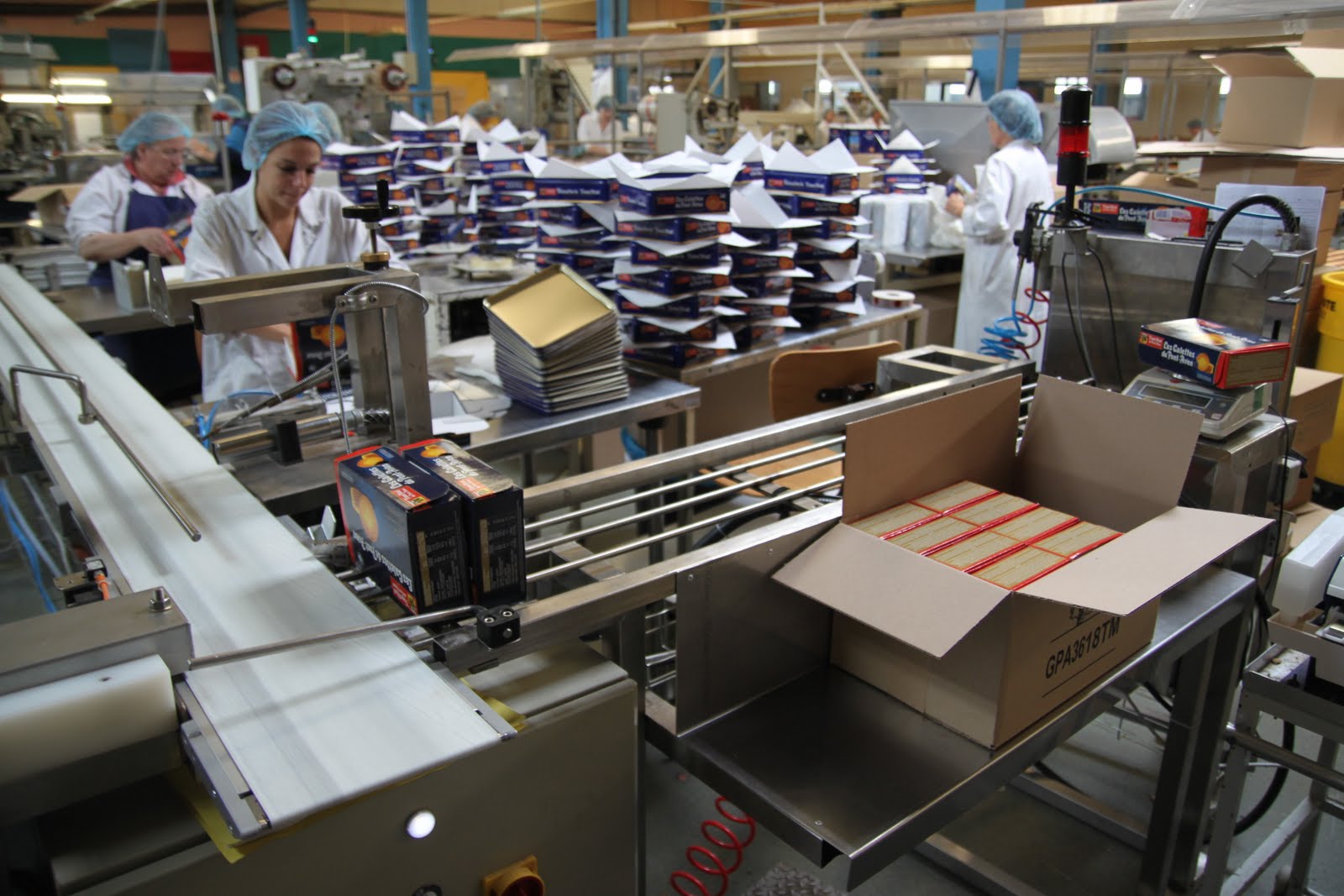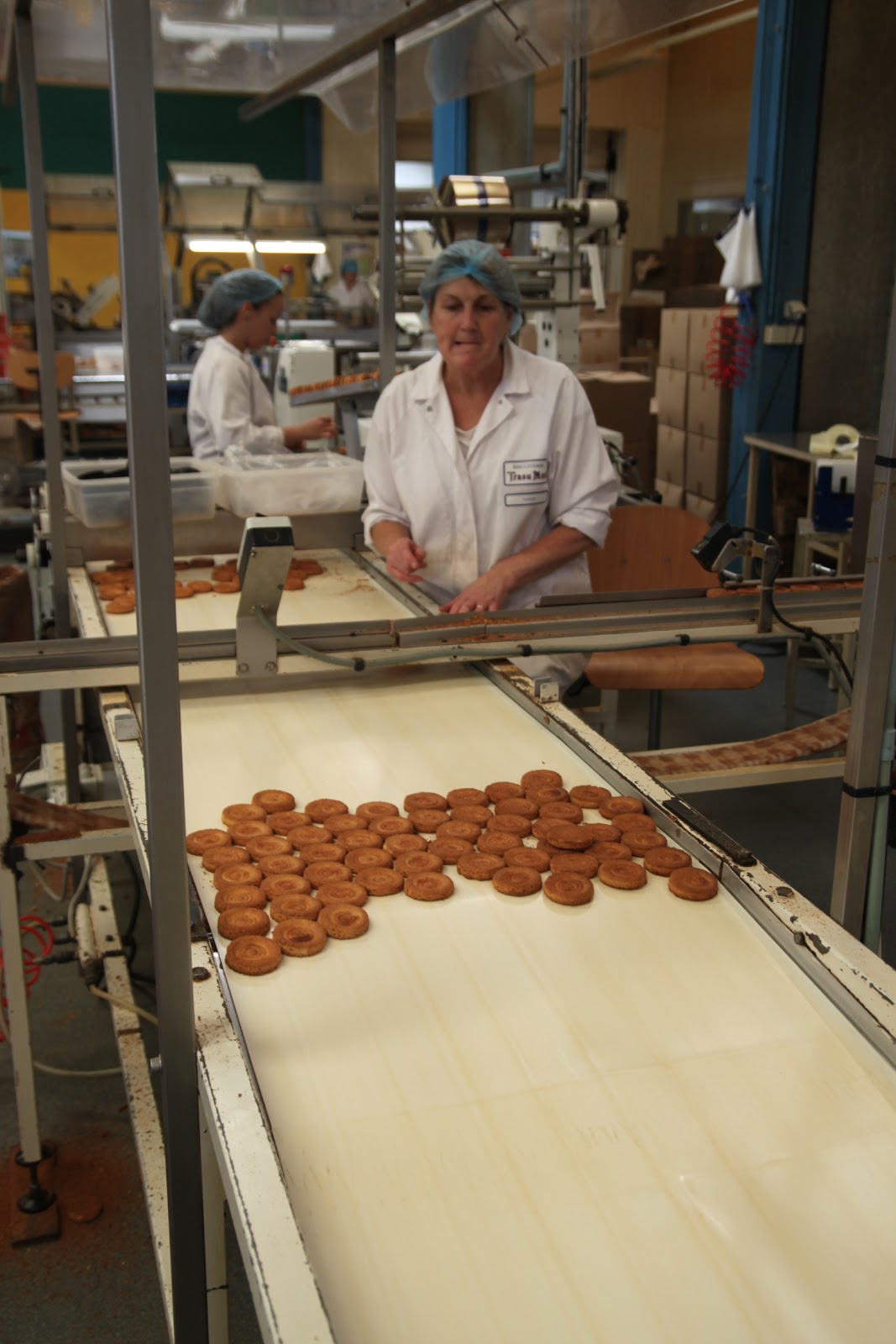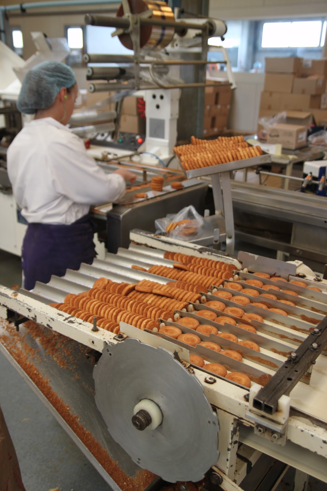 Après s’être équipé de charlotte pour les cheveux, d’une blouse et de protections pour les chaussures, on peut enfin rentrer. Ce qui surprend en premier? L’odeur de beurre et de gâteaux qui cuisent! Je me suis senti comme un petit enfant dans « Charlie et la Chocolaterie »!