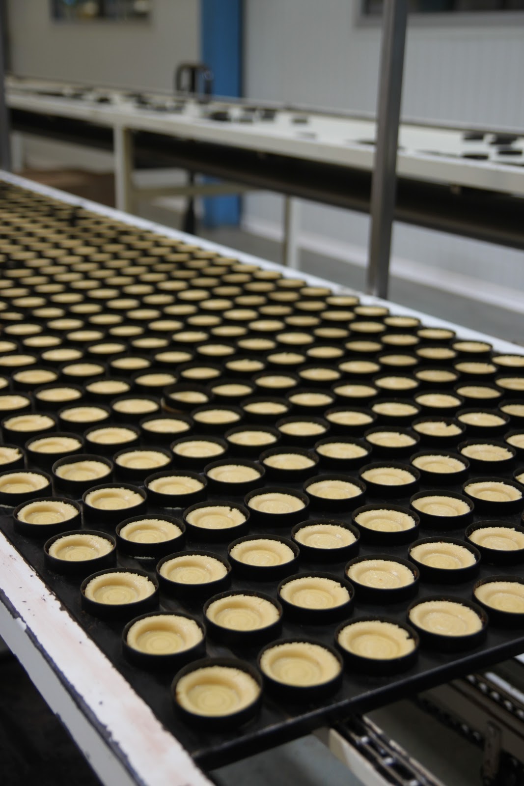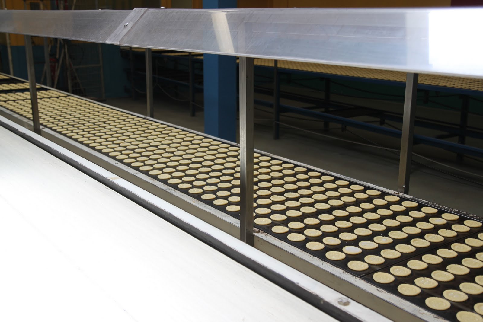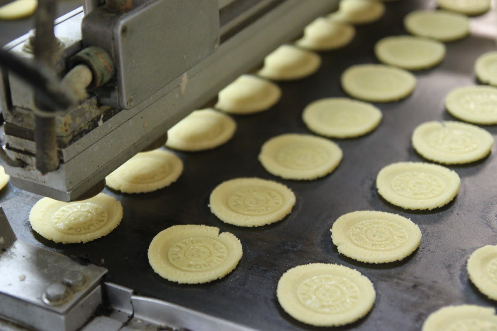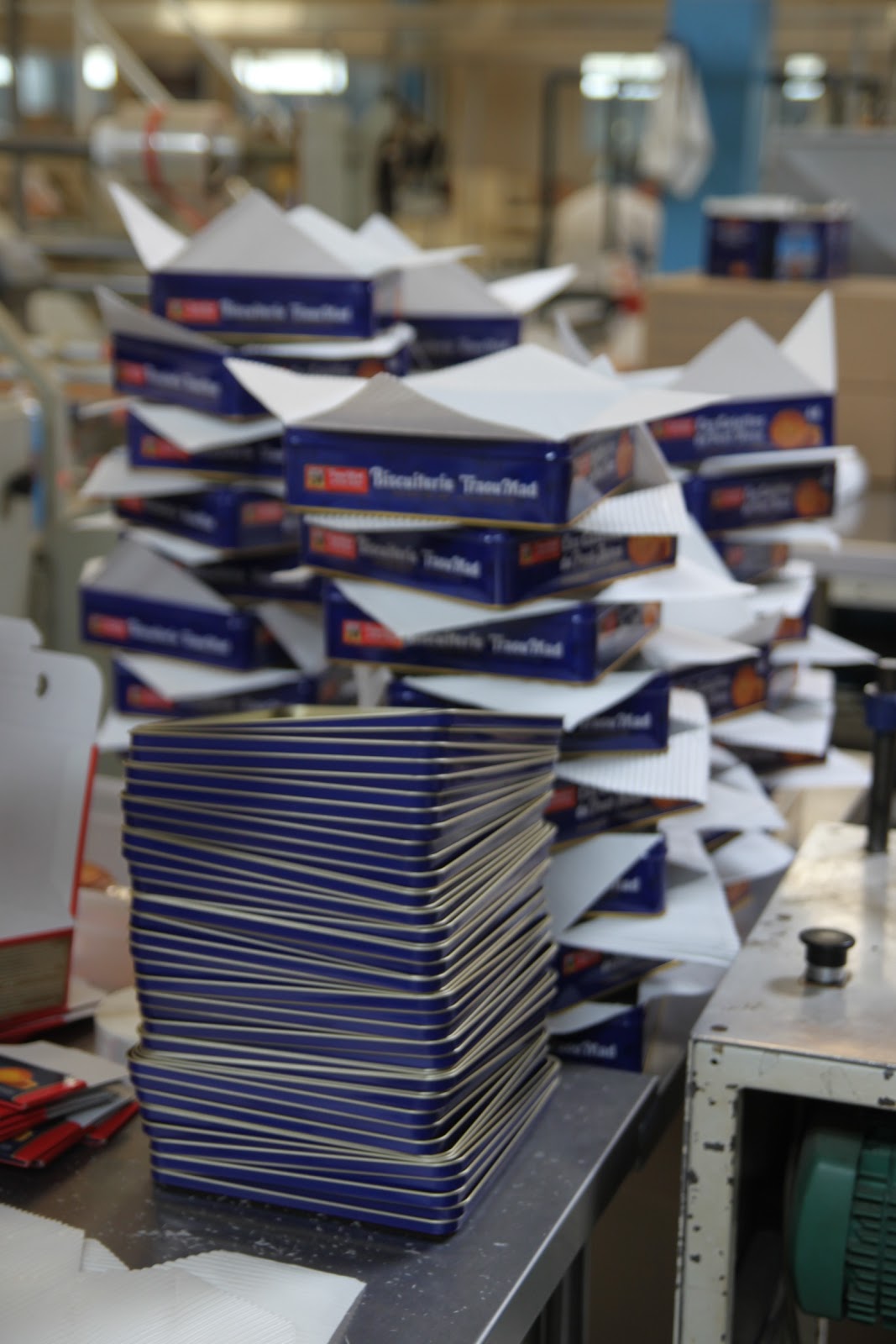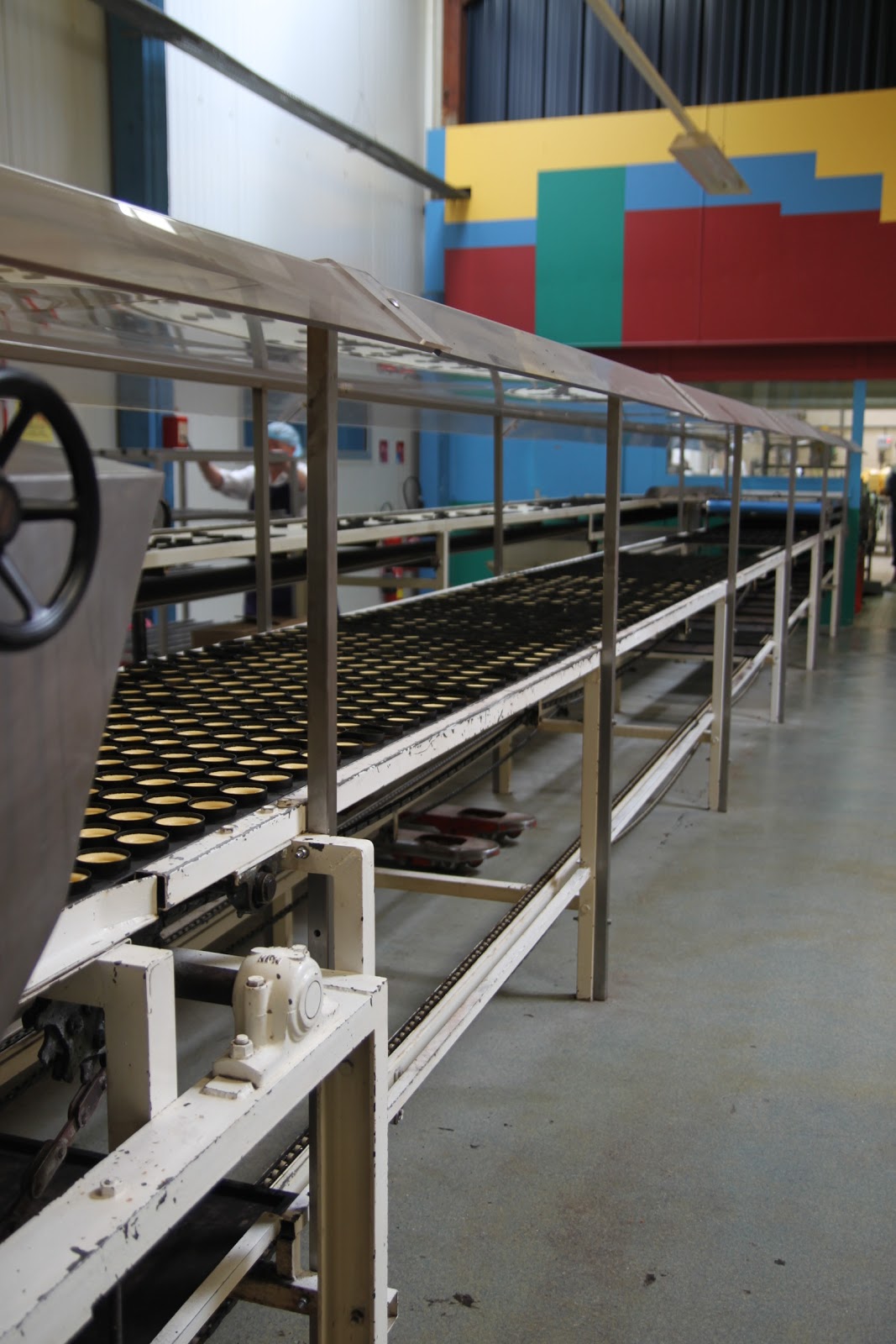 Après s’être équipé de charlotte pour les cheveux, d’une blouse et de protections pour les chaussures, on peut enfin rentrer. Ce qui surprend en premier? L’odeur de beurre et de gâteaux qui cuisent! Je me suis senti comme un petit enfant dans « Charlie et la Chocolaterie »!