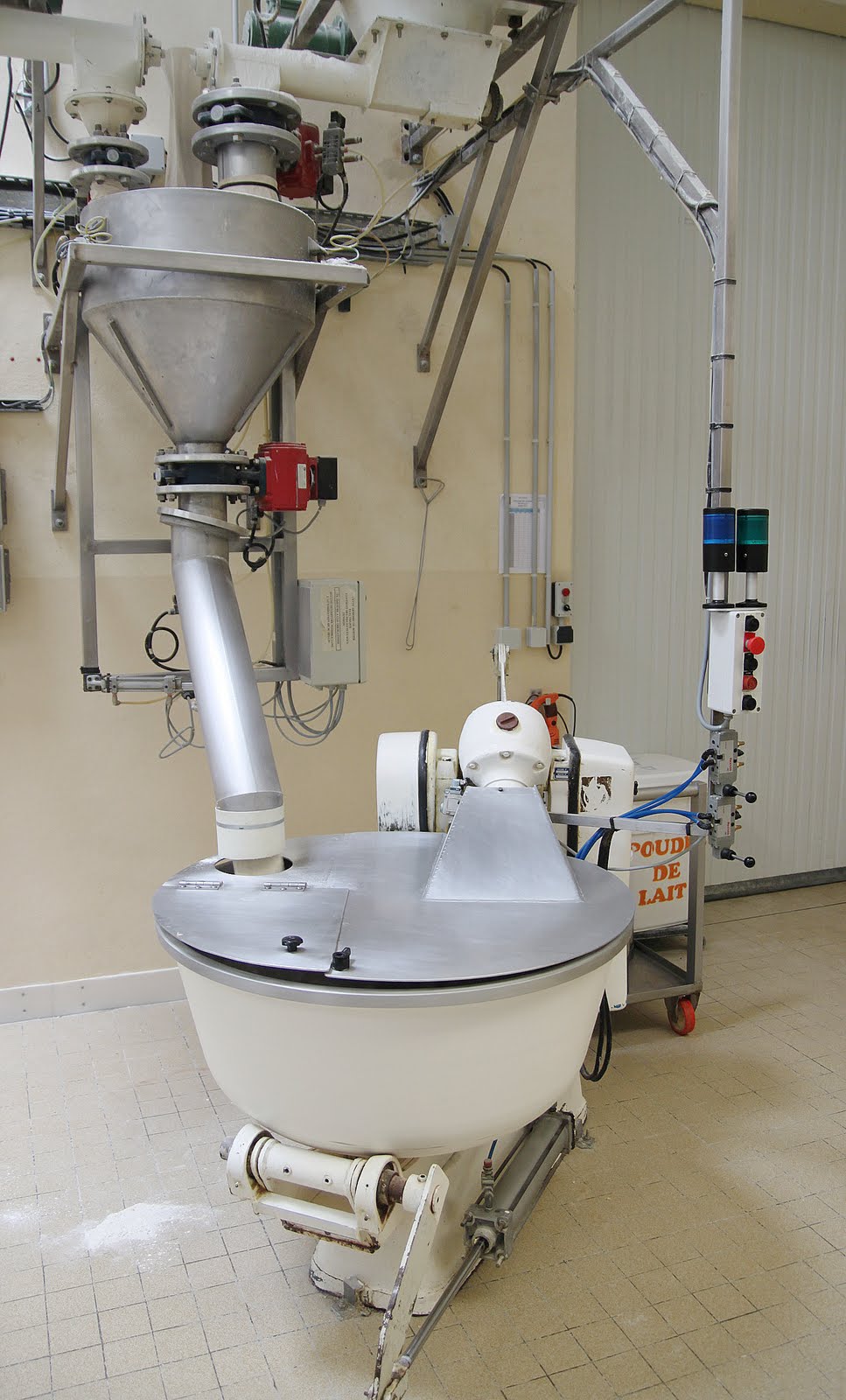 Le sillo à farine qui va aller déverser ses kilos directement dans la machine à pétrir. Et en dessous le sucre semoule.