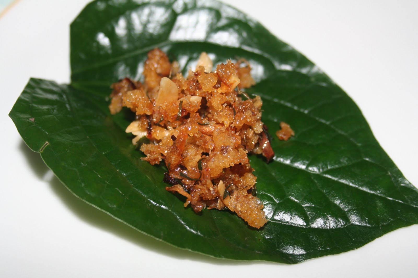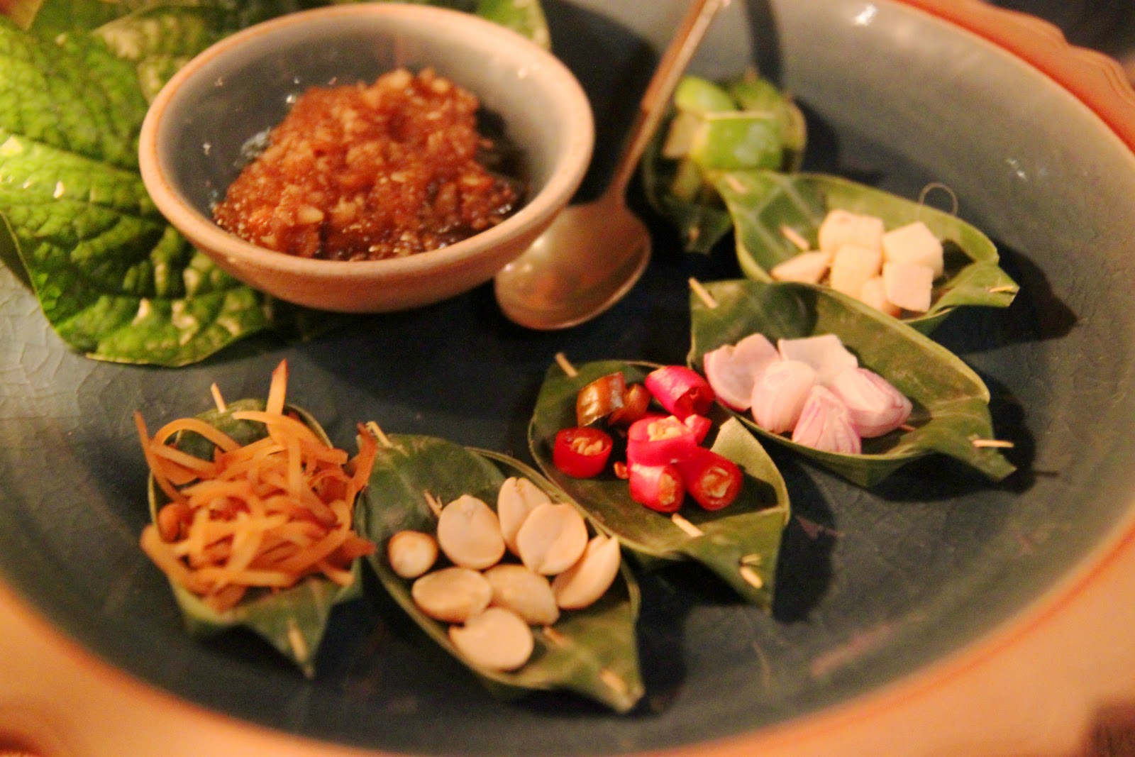 Comme le « Prig Khing Crob », qui est composé d’une feuille de betel (et non de blette comme je l’avais écrit précédemment!!), et d’une farce à la perche frite, cacahuètes, feuilles de kaffir ciselées et autres herbes… C’est Le plat que je mange à chaque fois que je me rends dans ce magnifique restaurant!