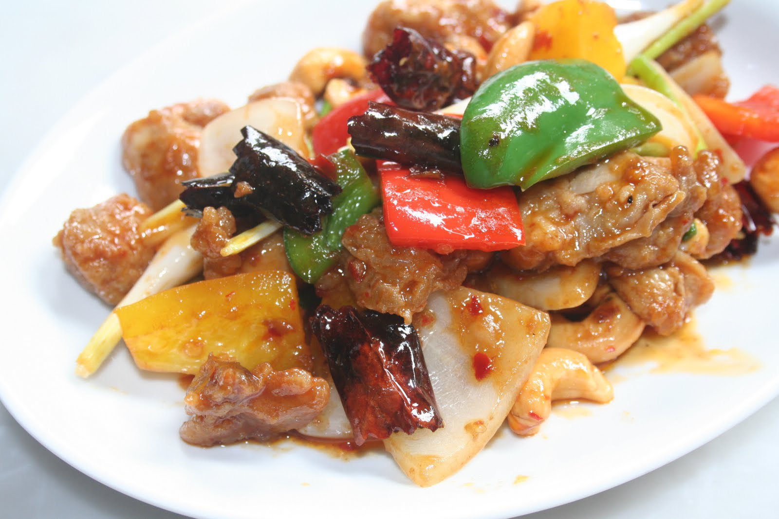 Le poulet sauté aux noix de cajou (poivrons, oignons et piments sont les autres légumes de ce plat).