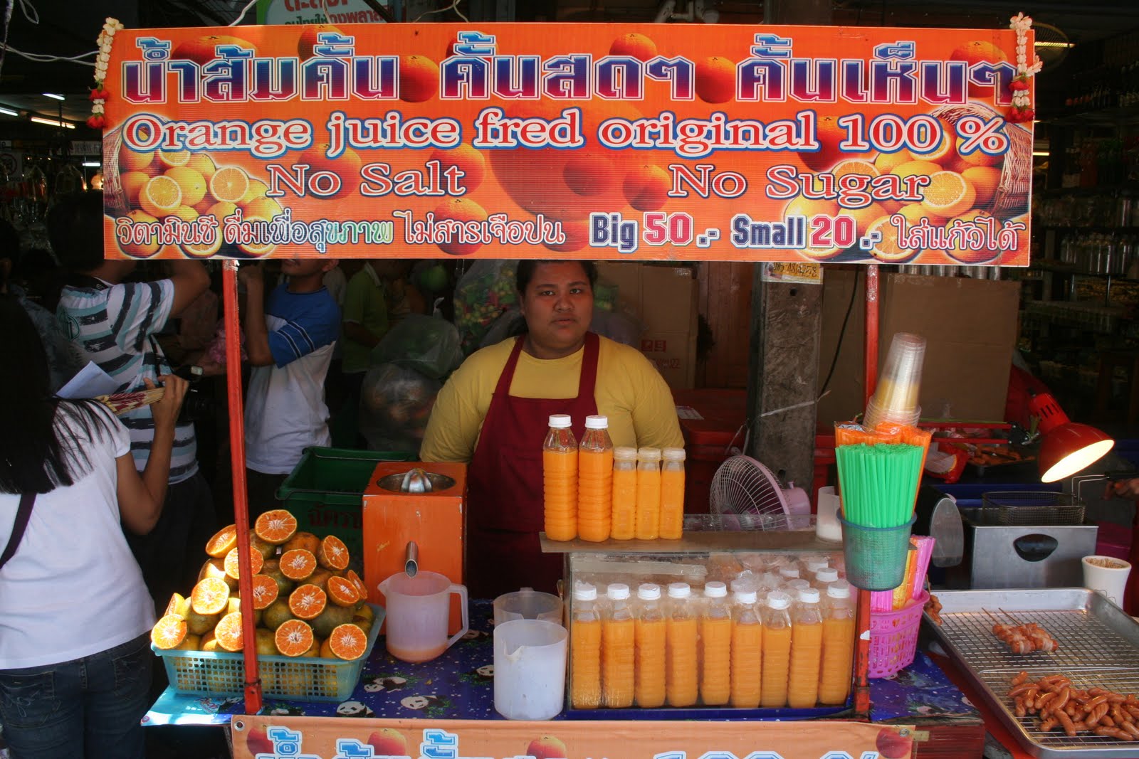 Comme ce vendeur de jus d’orange frais (les oranges ont une écorce verte et ont le goût de clémentine).