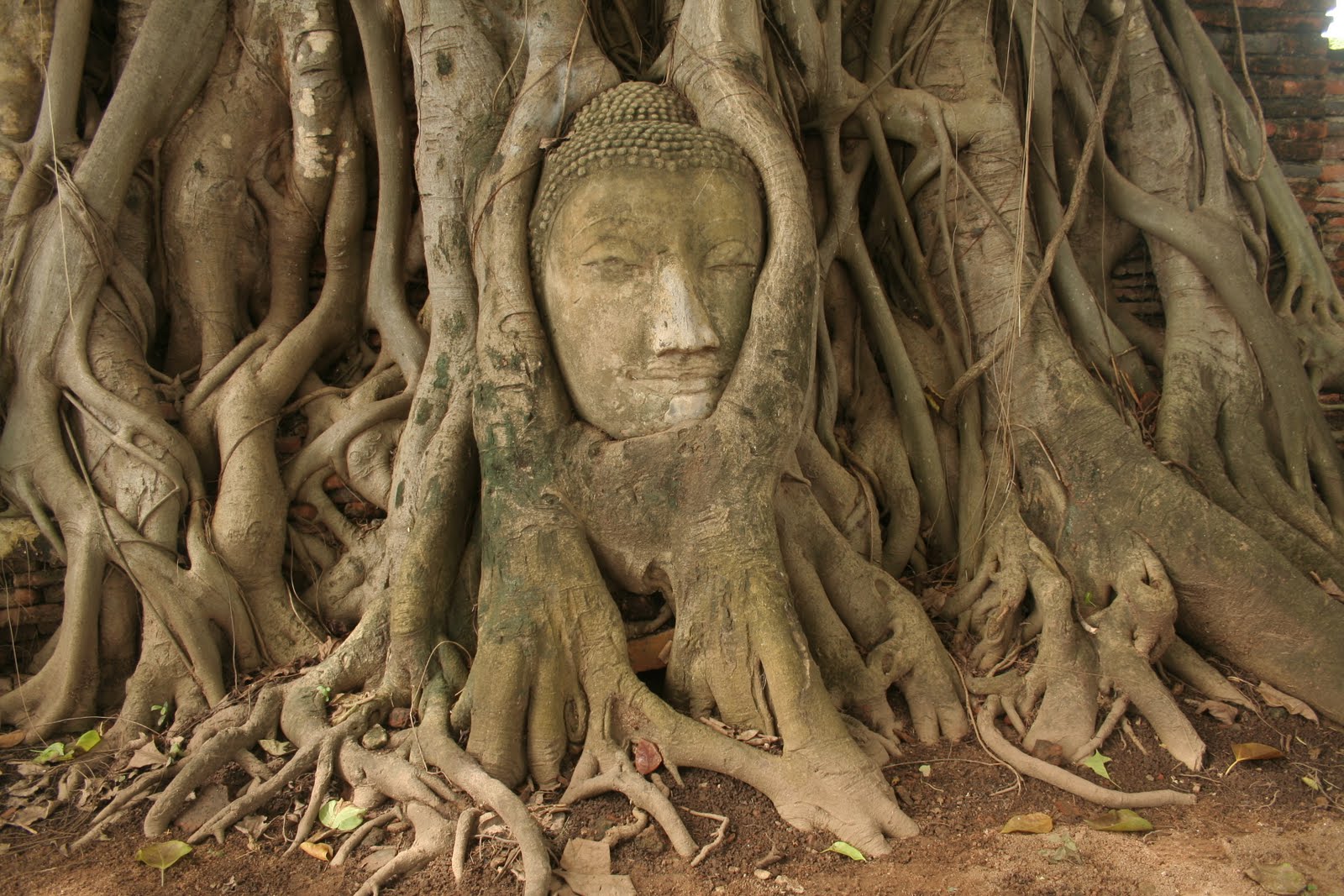 Cette tête de Bouddha provient de ruines que les racines de l’arbre ont délicatement enveloppée.