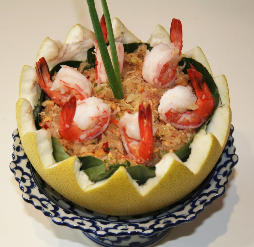 Je commence donc la présentation de quelques plats (qui sont déjà pour beaucoup présents en recette sur mon site!) très bon marché, comme d’ailleurs partout en Thailande. Voici la salade Yam Som-O au pomélo et aux crevettes avec piments, coriandre et cacahuètes:
