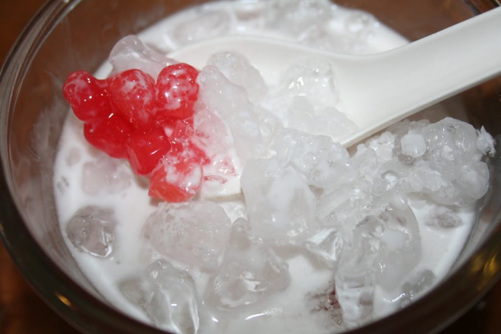 Et enfin, un dessert très typique: au lait de coco glacé et châtaignes d’eau dans un enrobage au tapioca, le tout aromatisé à la feuille de pandanus.