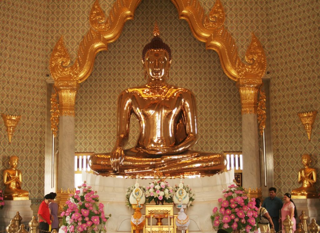 Je fais de nouveau une autre parenthèse non culinaire, pour juste parler du fabuleux Bouddha d’or qui parait être inconnu aux yeux des occidentaux et c’est pourtant une merveille à juste titre! Il faut absolument se rendre au Wat Traimit pour pouvoir admirer ce Bouddha de 3 mètres de hauteur et composé de 5,5 tonnes d’or pur!! C’est la plus grande statue en or qui existe, bien devant le masque de Toutankhamon et de Kate Moss (oui , il y a bien une statue d’elle en or massif de 50 kilos!). Mais ce Bouddha, sans doute d’époque Sukothaï a une histoire assez extraordinaire. Il a été réalisé au XIII ème siècle mais deux ou trois siècles plus tard, fût caché sous une couche de stuc laqué pour lui donner une apparence plus ordinaire et ainsi tromper l’ennemi birman sur sa valeur réelle! Mais tout cela tomba dans l’oubli et après plusieurs déplacements (entre Sukothaï et Ayutthaya, puis entre Ayutthaya et Bangkok…) la statue fût stockée pendant 30 ans entre les années trente et 1955 dans le quartier chinois dans un temple qui n’avait pas de logement pour elle, sous une tôle. Lors de son transfert final, une élingue céda et la statue se fendit à la base. Le lendemain on s’aperçut enfin que la statue était en fait en or…