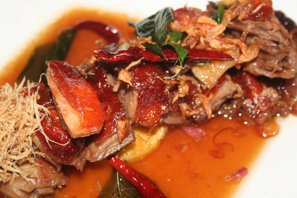 Un plat, le « Ped Yaang Naam Makham » où se mélangent harmonieusement du canard, une sauce au tamarin et des morceaux d’ananas grillé.