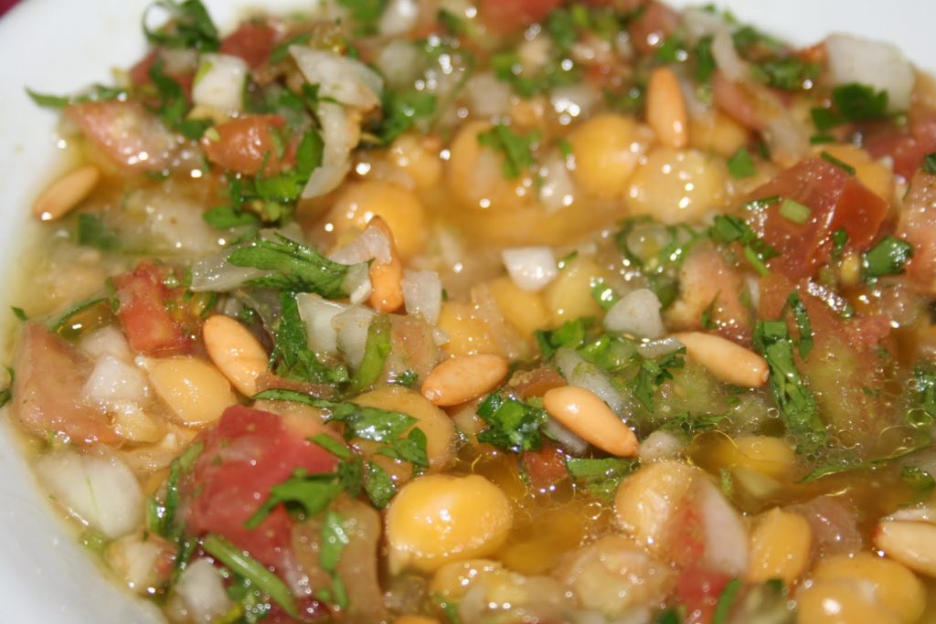 Je ne me rappelle plus du nom de ce plat (je vais vérifier la prochaine fois!), mais ce plat contenait pois chiches, corandre, tomates, pignons grillés, oignons, cumin…