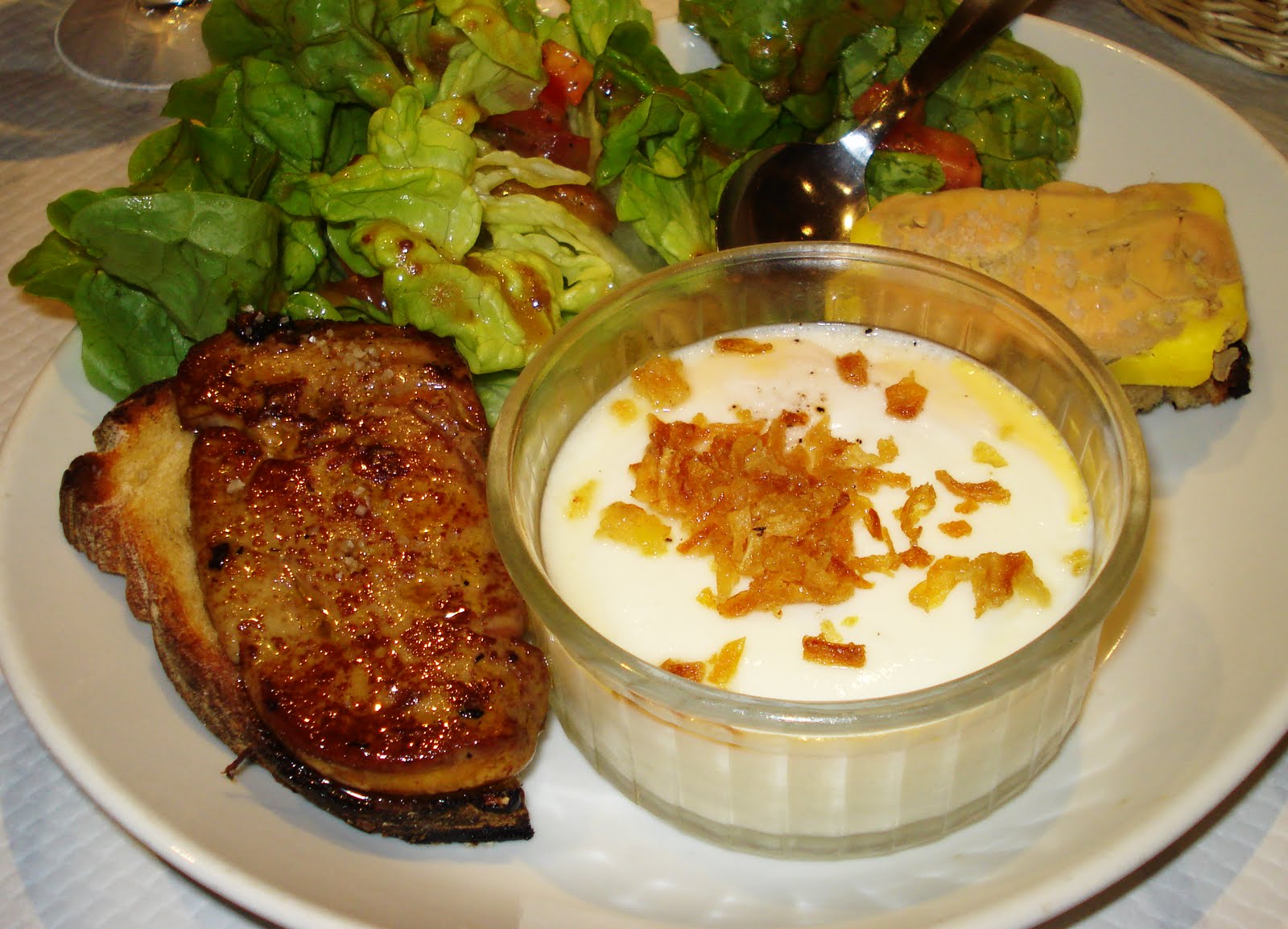 En entrée, un décadent oeuf cocotte avec ses deux foies gras. L’un en terrine « maison » et l’autre poêlé, les deux sur une grosse tranche de pain grillé.