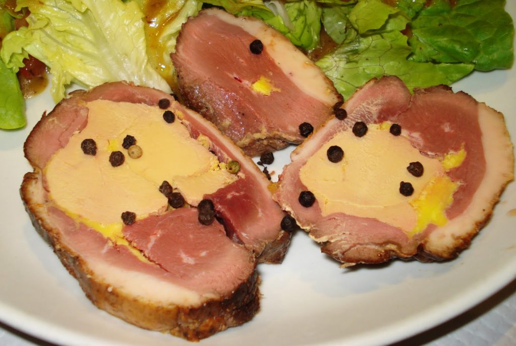 Et en plat…une deuxième entrée! Car mon estomac était déjà bien rempli… Mais ce magret froid prenant en sandwich un foie gras ne m’a pas fait peur pour autant!