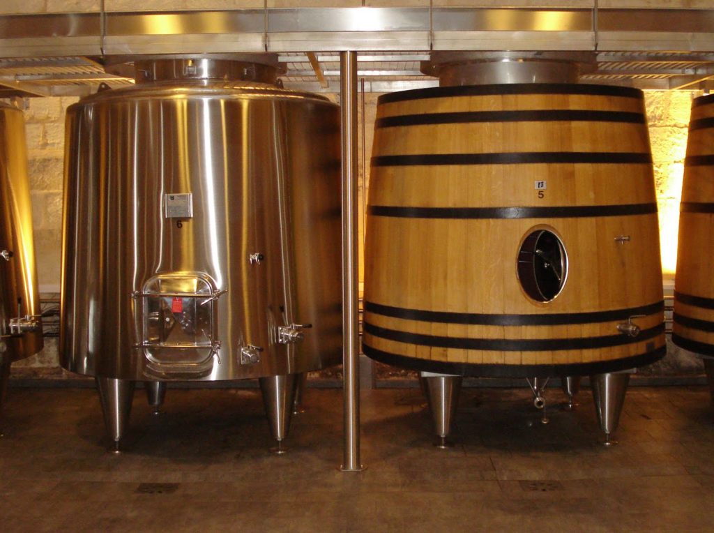 On se retrouve alors dans une salle énorme où 10 giganstesques cuves (5 en bois et 5 en métal) servent à faire macérer les baies de raisin à froid, puis à chaud, pour la fermentation alcolique.