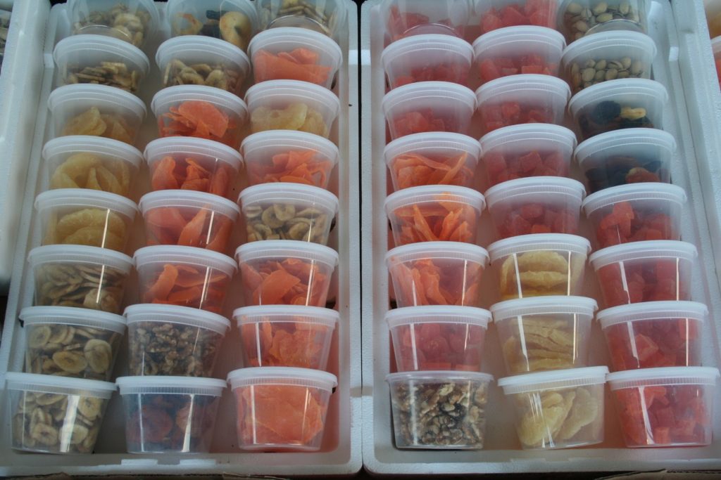 Quelques fruits secs en boites hermétiques que l’on trouve souvent dans les « delis » américains. Ceux qui connaissent New-York se souviendront sûrement avoir vu ce genre de boites avec des noix de cajou ou autres fruits secs!