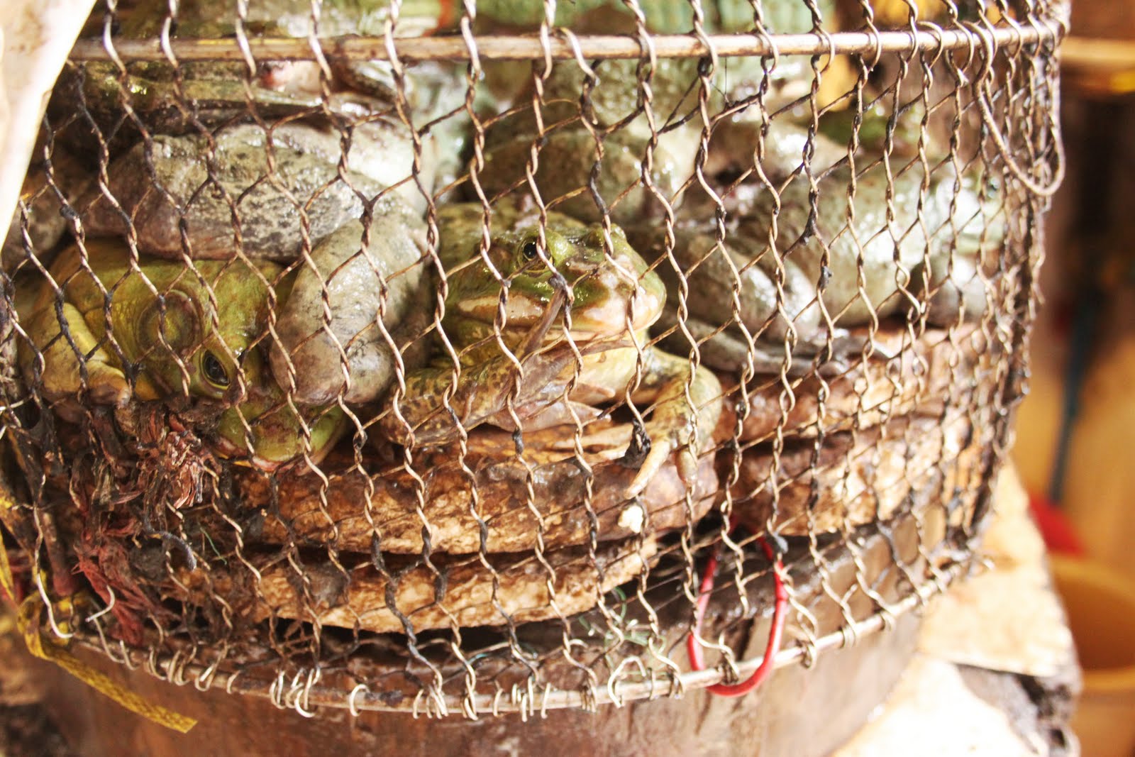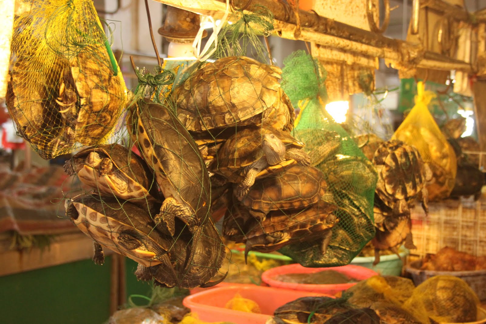 Et voici le marché qui m’a fait mal au coeur. J’ai hésité à mettre les photos, mais finalement je ne fais que rendre compte des différences culturelles de notre planète. Je ne censurerai donc jamais rien… (comme pour un futur voyage en Amazonie).
