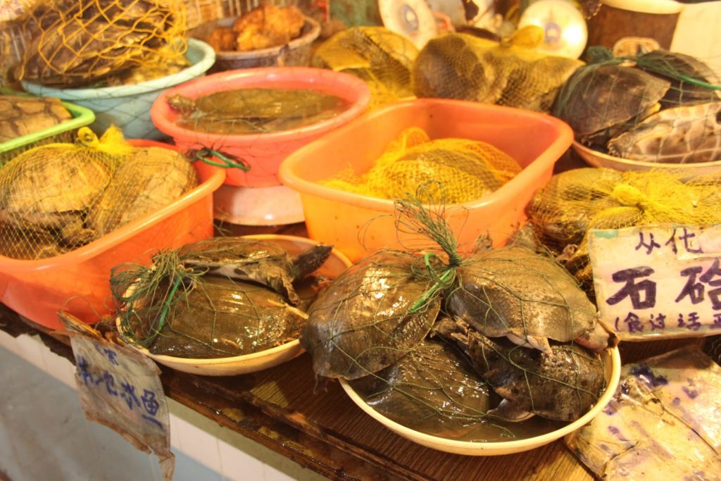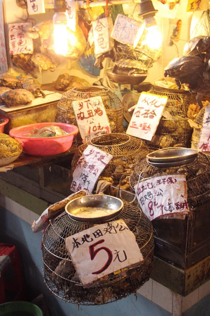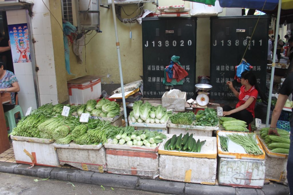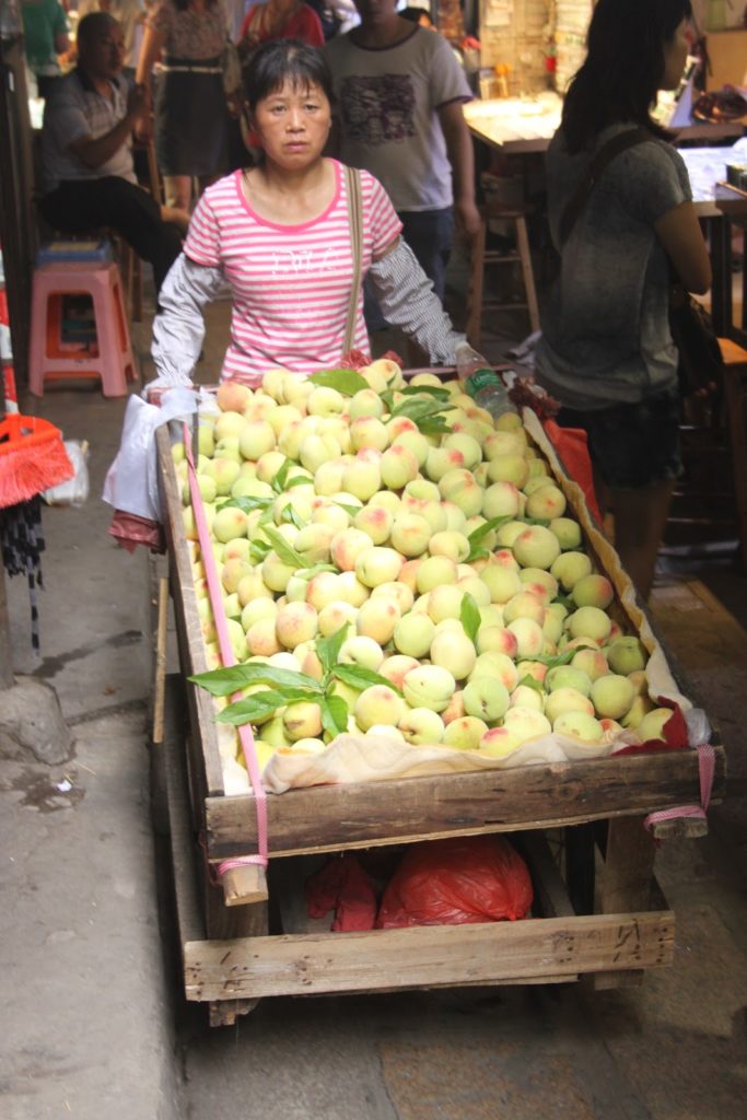 Dès mon arrivée à Canton, je me précipite au Liwan Plaza… Un centre commercial de pierres précieuses, semi-précieuses et des pierres de collection minéralogique (une autre de mes passions!). Un centre hallucinant sur lequel je ne vais pas m’attarder ici. Mais au pied de ce centre se trouve un labyrinthe de marchés qui s’entrecroisent. On commence doucement avec des fruits et des légumes!