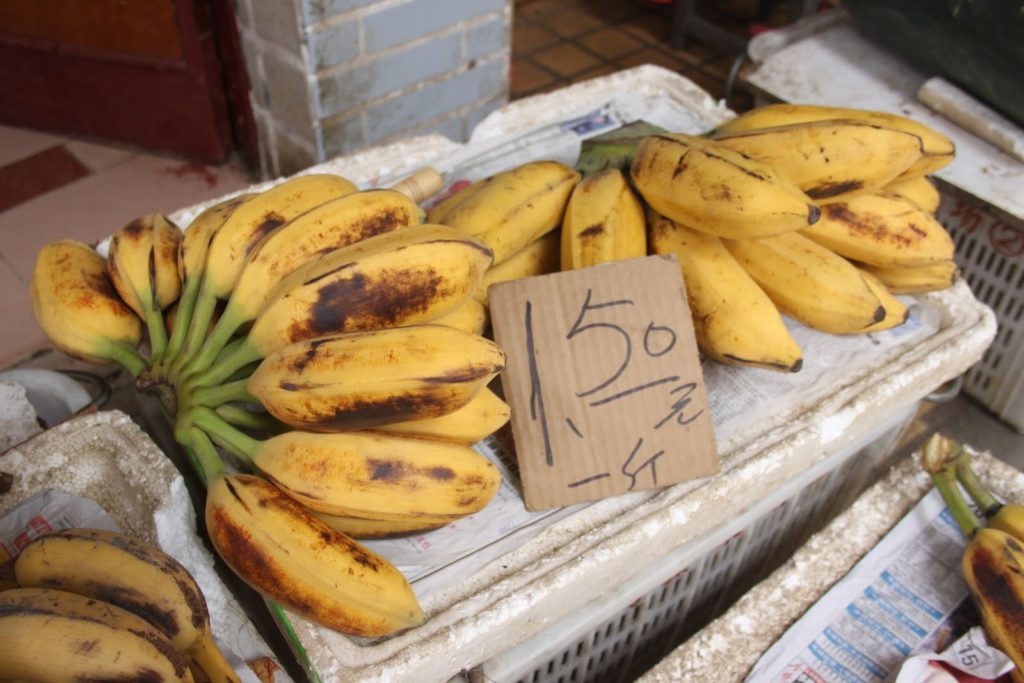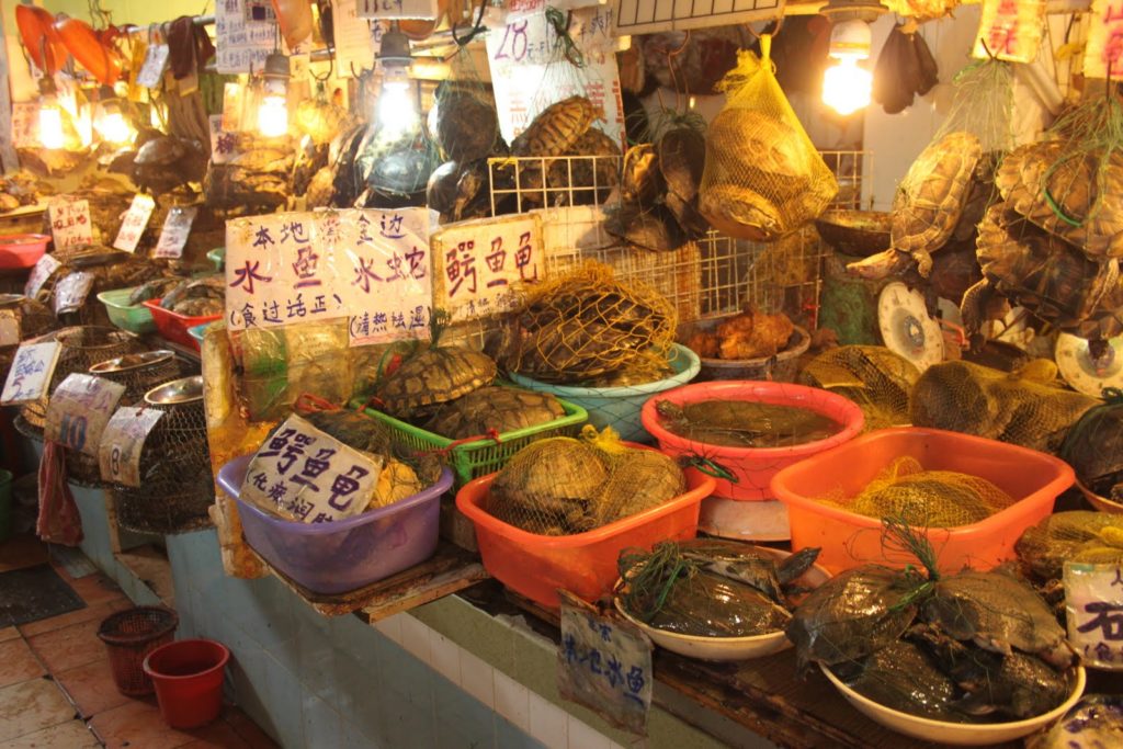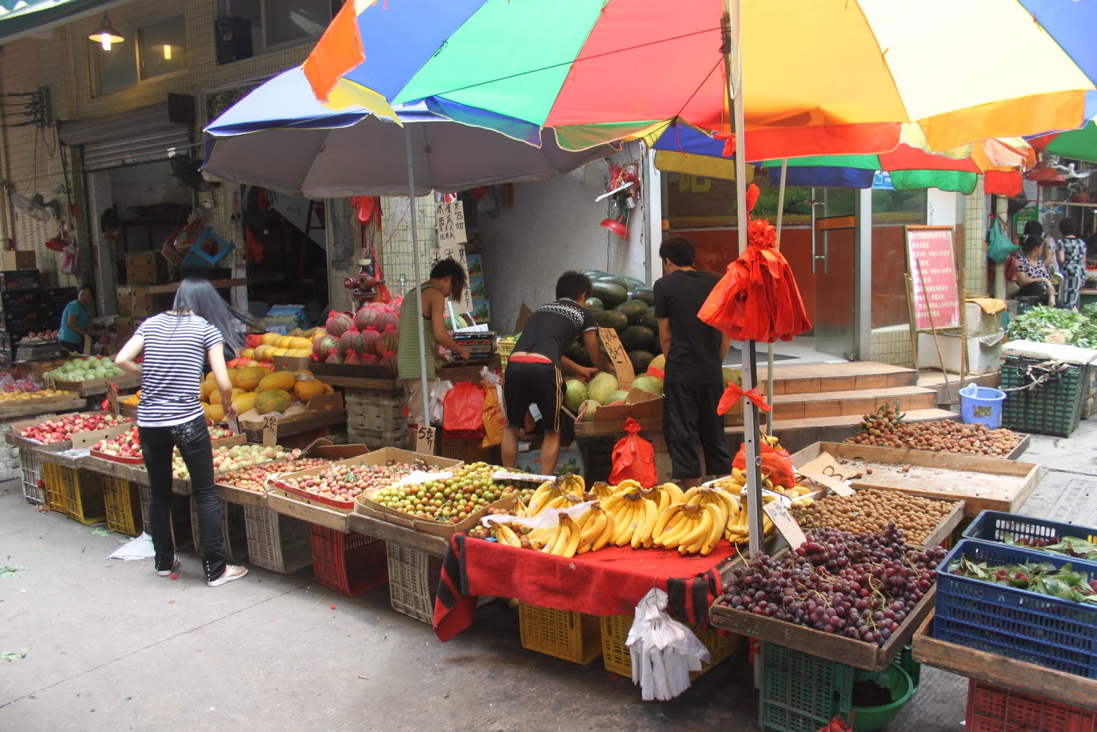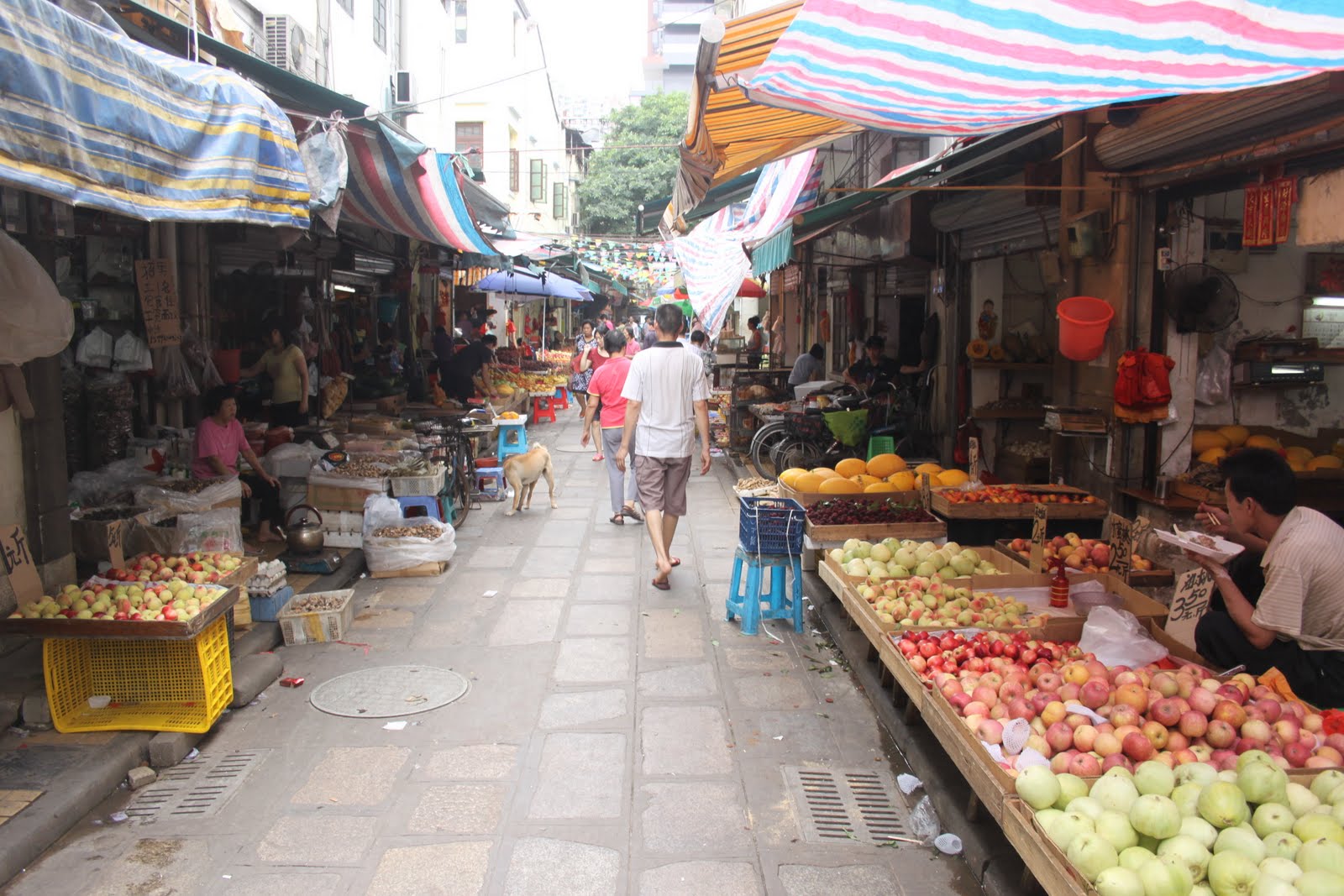 Dès mon arrivée à Canton, je me précipite au Liwan Plaza… Un centre commercial de pierres précieuses, semi-précieuses et des pierres de collection minéralogique (une autre de mes passions!). Un centre hallucinant sur lequel je ne vais pas m’attarder ici. Mais au pied de ce centre se trouve un labyrinthe de marchés qui s’entrecroisent. On commence doucement avec des fruits et des légumes!