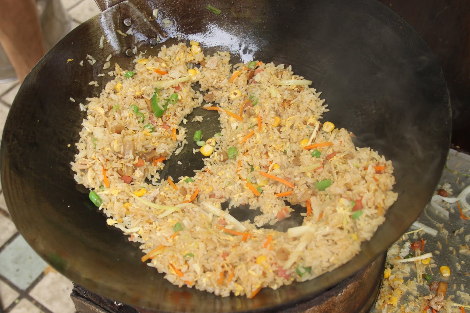 Et avec quelques légumes frais et du bon riz, on réalise le meilleur riz cantonnais du monde! Tout cela pour quelques yuans.