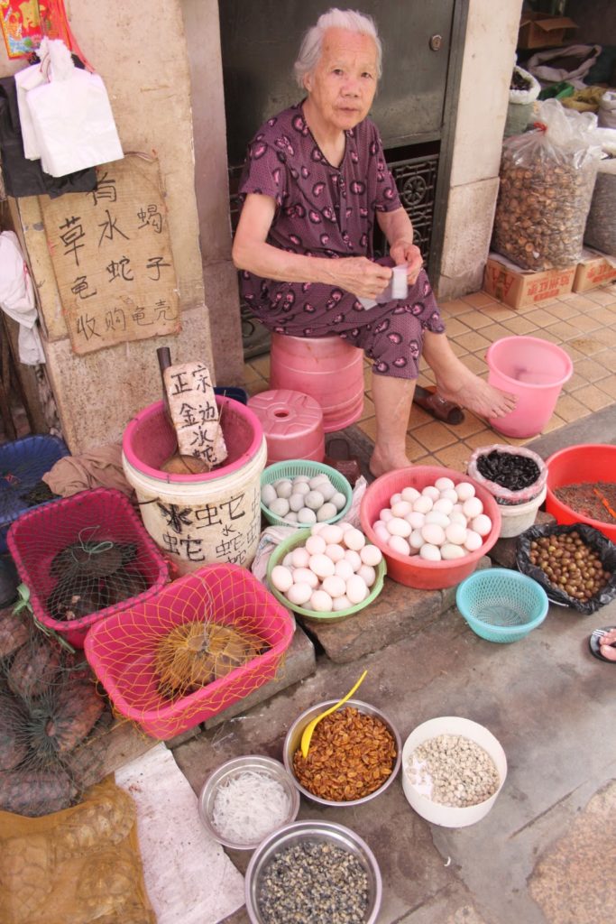 Et ma petite grand-mère préférée du marché qui vend tout plein de bonnes choses… Oeufs, crevettes séchées, tortues, scorpions… Vous ne croyez pas?