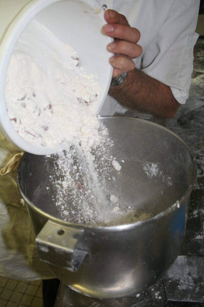 Notre chef Patrick Sarthou met dans le bol pétrisseur du robot les trois premiers ingrédients, farine, sucre et amandes françaises.