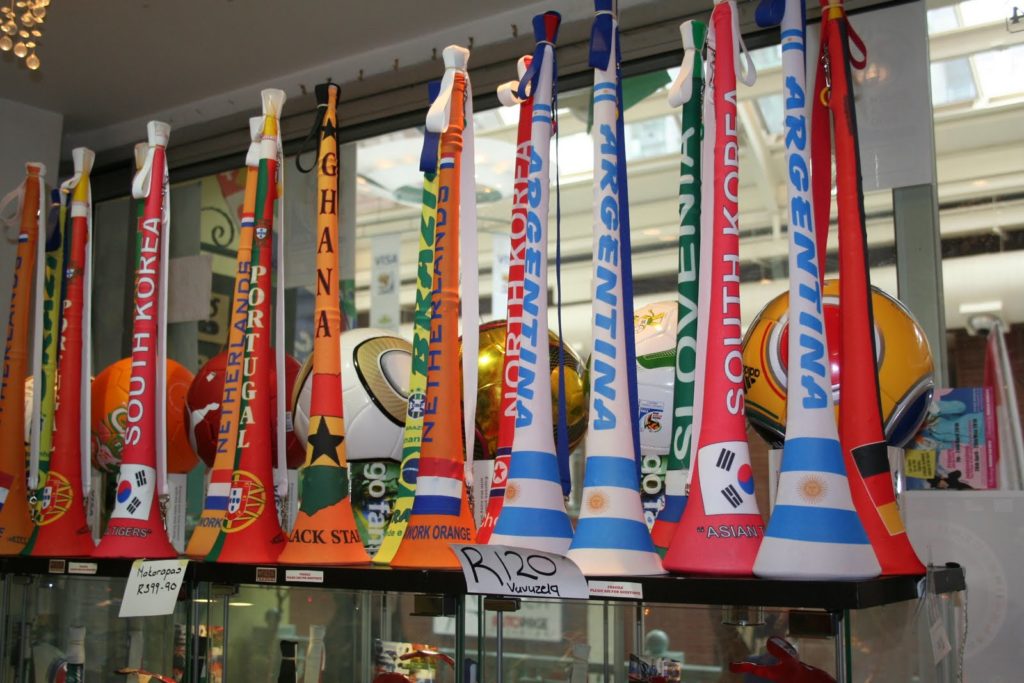 Un clin d’oeil rapide même si cela n’a rien de gastronomique, mais il fallait quand même prendre en photo les vuvuzelas…! Et oui je confirme, c’est très bruyant! Surtout quand les gens s’y mettent pour la première fois et que le son ressemble plus à un pet d’éléphant qu’à un véritable son de corne!