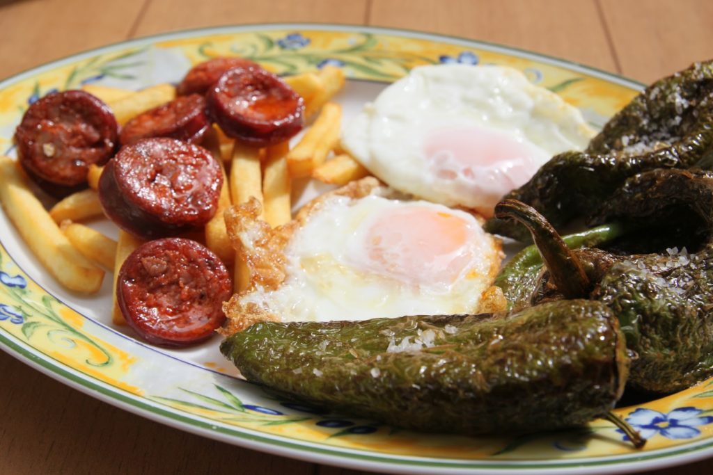 Un autre plat typique de la région: de petits poivrons verts passés à la friture (toujours à l’huile d’olive), des oeufs et du chorizo…
