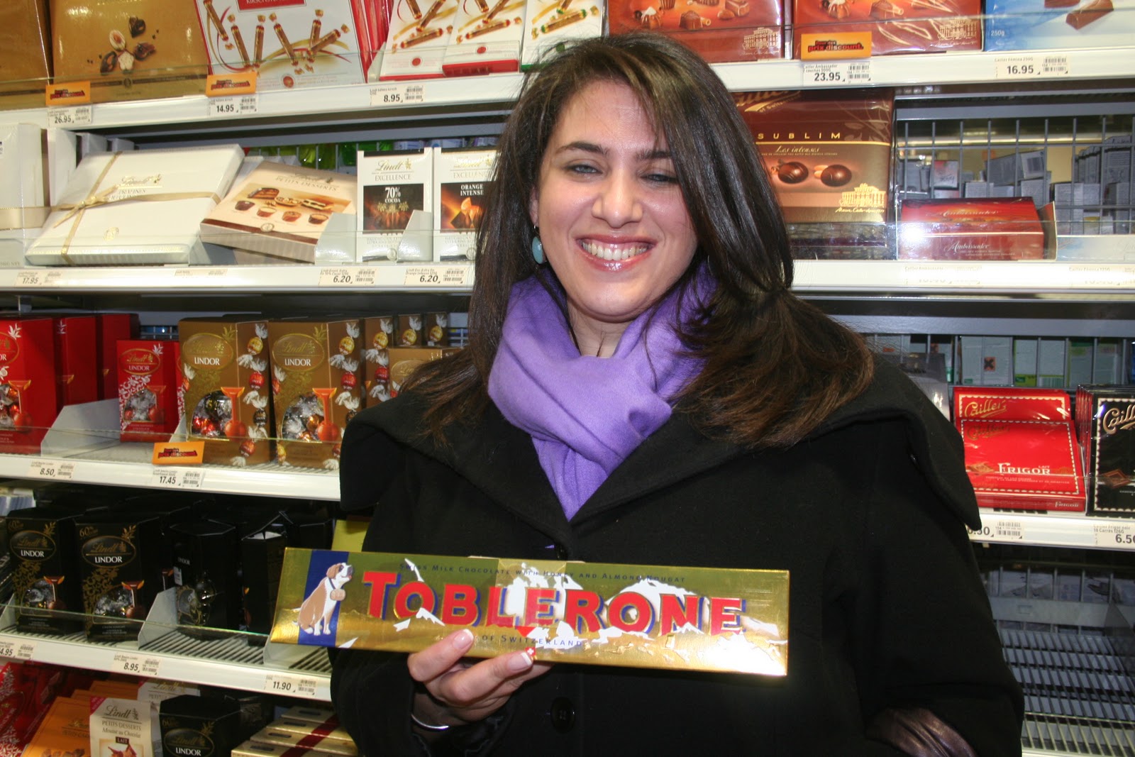 Un petit tour au supermarché « Coop » avec ma très chère amie Nadine, grâce à qui j’ai pu découvrir ou redécouvrir toutes ces merveilles. Elle nous présente ici un toblerone local de taille somme toute assez modeste. Il y en a de véritablement géants! Mais on les trouve dans tous les aéroports du monde de nos jours.