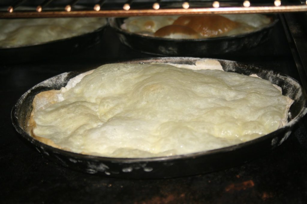 La fameuse tarte flambée en pleine cuisson au four en train de gonfler et de crépiter…