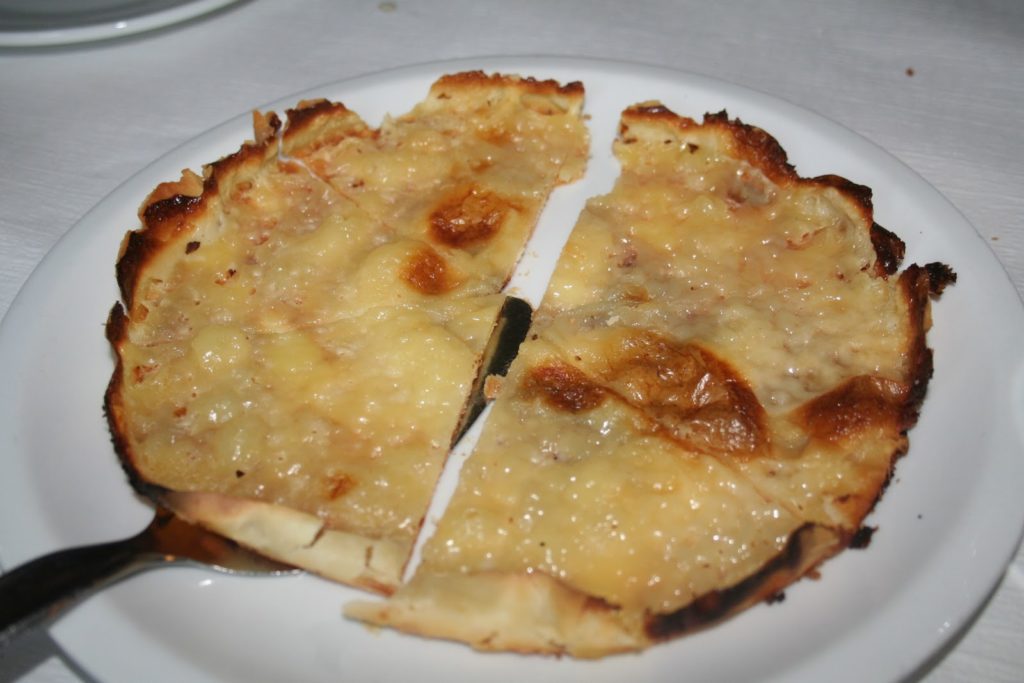 En dessert, une tarte flambée à la crème. Une fine pâte (mais vraiment très fine!!) avec sur le dessus, un mélange de crème double de gruyère (mais ce n’est plus du fromage, juste une crème très épaisse à 50%) et de sucre. Le tout caramélise légèrement et donne un goût et une texture inimitables.