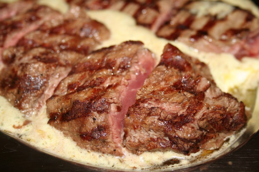 De quoi s’agit-il exactement? C’est donc de l’entrecôte saignante dans un bain de beurre aux herbes et épices (dont la composition est secrète!).