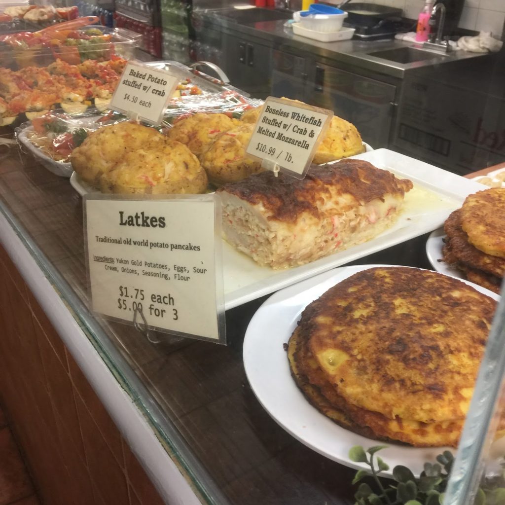 Il y a un traiteur de cuisine juive avec des plats assez appétissants.