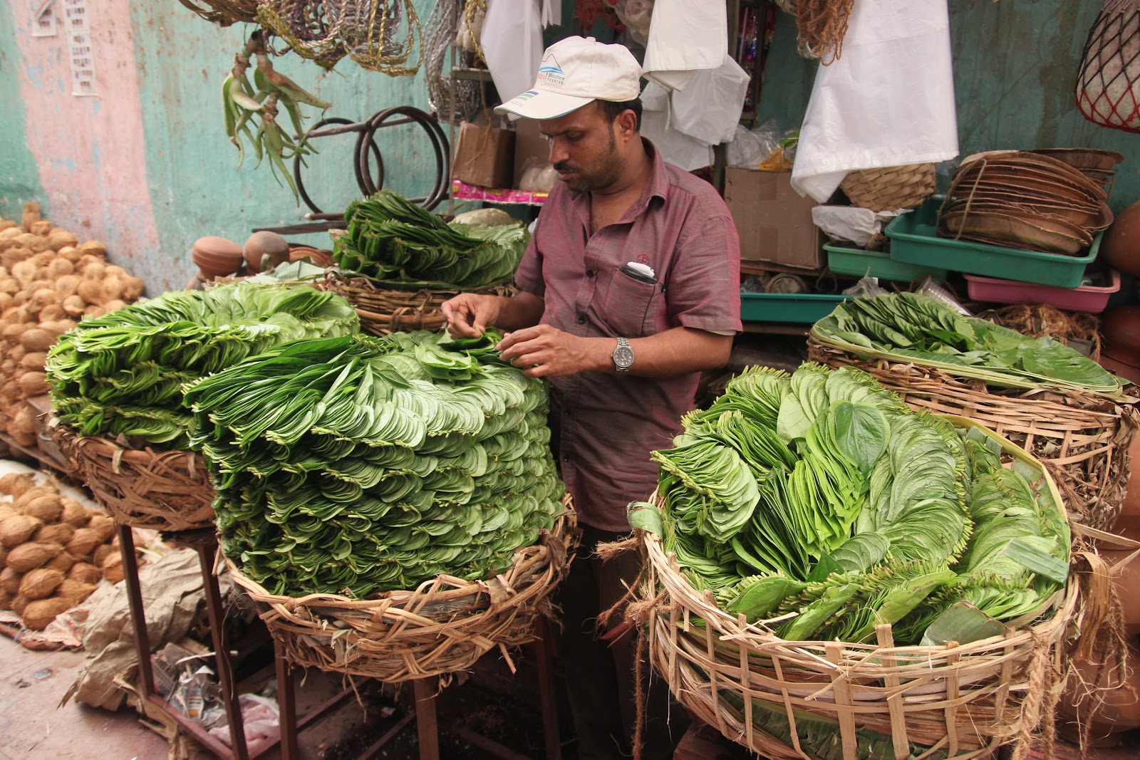 On trouve beaucoup d’échoppes vendant des feuilles de betel. On remarquera l’incroyable travail que demande le rangement méticuleux de celles-ci! Il faut beaucoup de patience pour ranger ces milliers de feuilles, ce qui les préservera bien mieux!