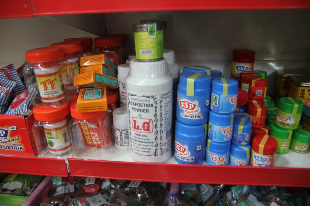 On trouve l’ase fétide ou « asafoetida », cette épice qui était utilisée au moyen âge en Europe mais qui est restée très employée en Inde. C’est un peu surprenant car c’est d’abord une effluve d’oeuf pourri qui arrive en premier (d’où le nom). Mais en même temps et étonnamment elle donne envie de l’utiliser dans la cuisine. Je m’en suis bien sûr procuré un petit pot. Pour le goût, c’est celui que l’on trouve dans les popadums « natures » que les fans de cuisine indienne connaissent bien.