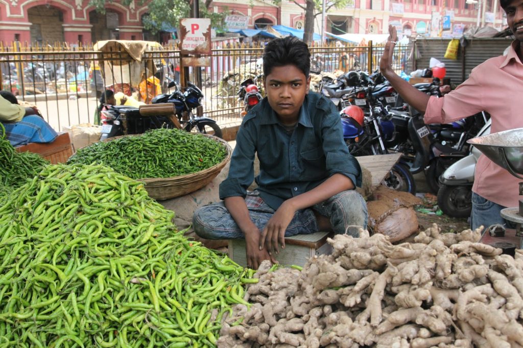 En sortant du marché, une dernière photo de ce jeune vendeur qui voulait son portrait, avec son grand frère qui vient l’embêter à ses côtés! Les piments utilisés ici ne sont pas si forts que cela et rentrent dans la composition de multiples plats indiens.