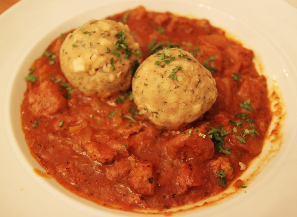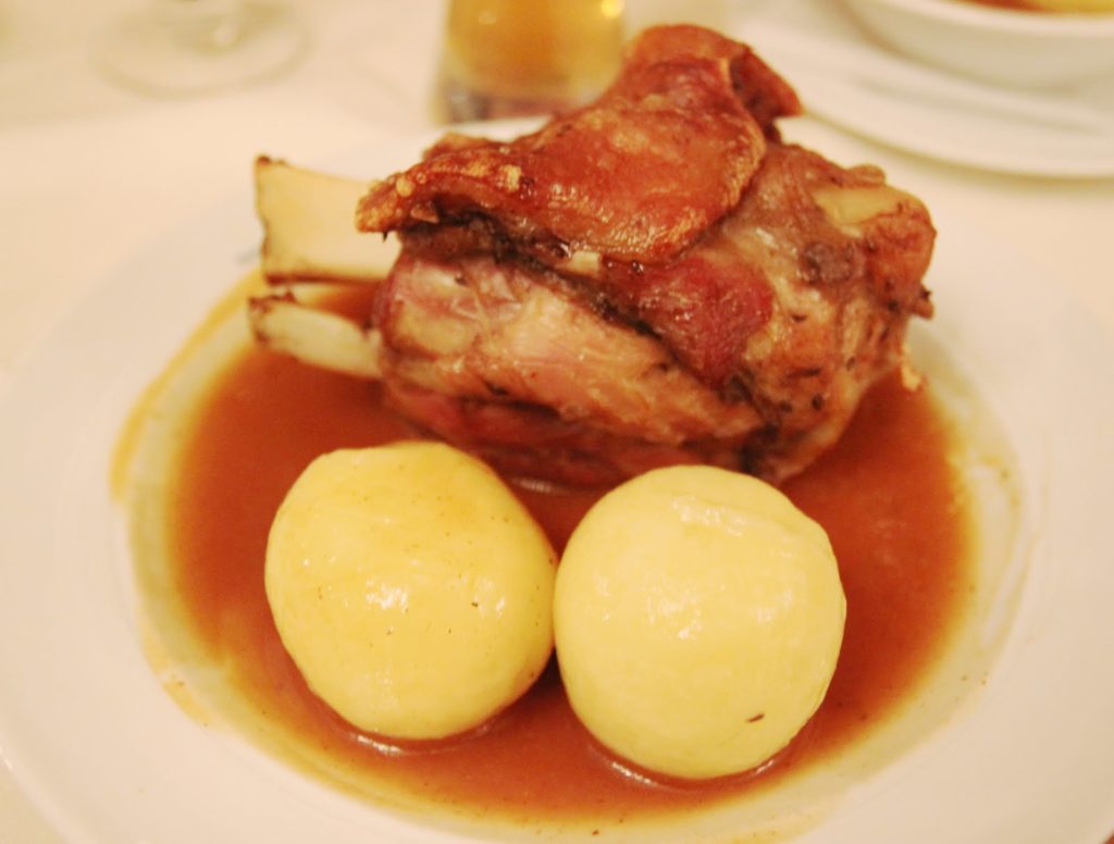 Surtout un jambonneau grillé aux knödels. Les Knödels sont des boulettes un peu molles, de tailles variées, à la pomme de terre, à la semoule ou bien encore à la mie de pain rassis.