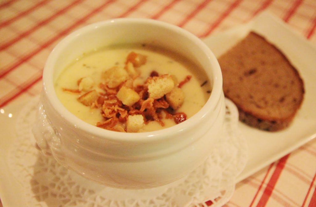 Une soupe aux pommes de terre et fromage, servie avec du bacon grillé et des croûtons.