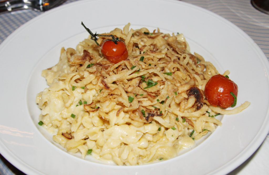 On y vient pour Käse Spätzles. Les Spätzles sont aussi connus en Alsace, et sont en gros une pâte à nouilles passée à travers une passoire, directement dans l’eau bouillante. Ils sont servis dans une sauce crémeuse au fromage, avec plein d’oignons frits!
