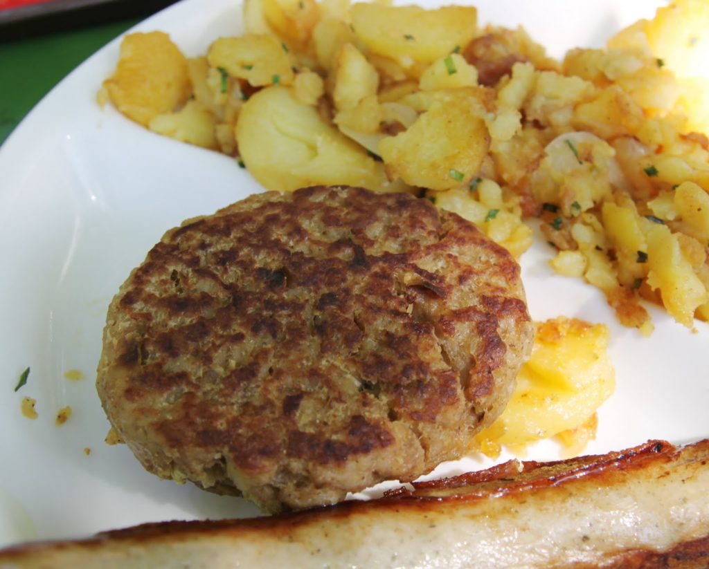 Arrêt obligatoire pour un déjeuner entre amis. Pommes de terre sautées, saucisses et boulettes de viande aplaties (fricadelles), le tout avec la süßer senf, cette délicieuse moutarde sucrée!
