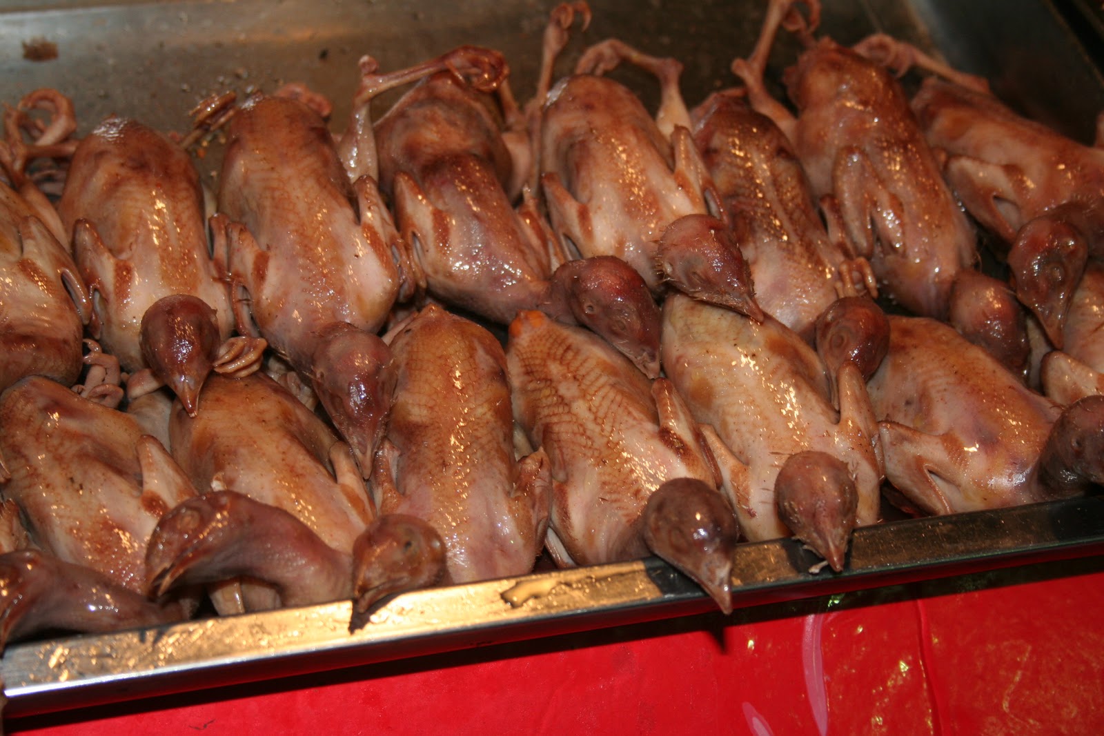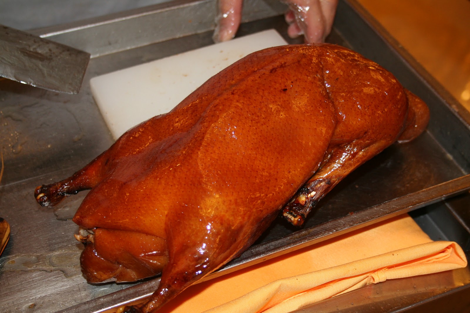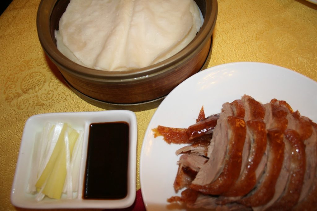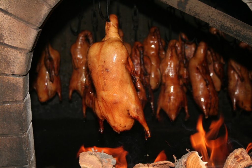 Voici donc enfin après les bonds qu’ont fait nos estomacs avec les marchés précédents, le célèbre canard laqué! J’ai essayé plusieurs endroits à Pékin et c’est toujours avec un grand plaisir gustatif que j’en découvre de nouveaux! Le canard laqué nécessite entre 24 et 48 heures de préparation avant de le manger. On doit d’abord soulever la peau du canard en pratiquant une incision au niveau du croupion puis en soufflant. Le canard est ensuite enduit d’une marinade composée de miel et de sauce de soja. On le laisse ensuite sécher à l’air libre pendant une ou deux journées avant de le cuire dans un four au feu de bois.
