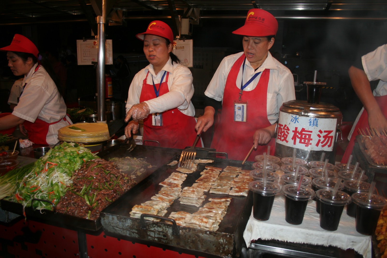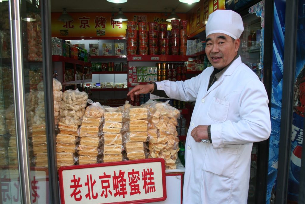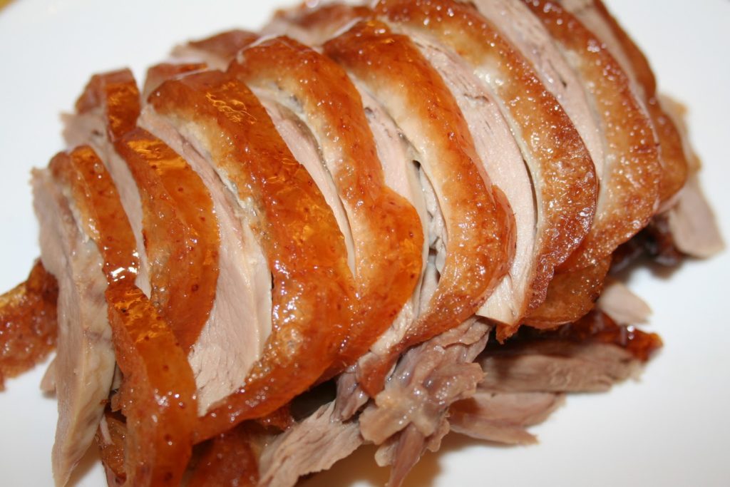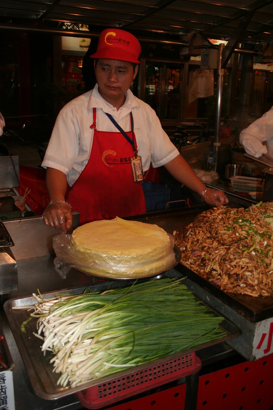 Voici donc enfin après les bonds qu’ont fait nos estomacs avec les marchés précédents, le célèbre canard laqué! J’ai essayé plusieurs endroits à Pékin et c’est toujours avec un grand plaisir gustatif que j’en découvre de nouveaux! Le canard laqué nécessite entre 24 et 48 heures de préparation avant de le manger. On doit d’abord soulever la peau du canard en pratiquant une incision au niveau du croupion puis en soufflant. Le canard est ensuite enduit d’une marinade composée de miel et de sauce de soja. On le laisse ensuite sécher à l’air libre pendant une ou deux journées avant de le cuire dans un four au feu de bois.