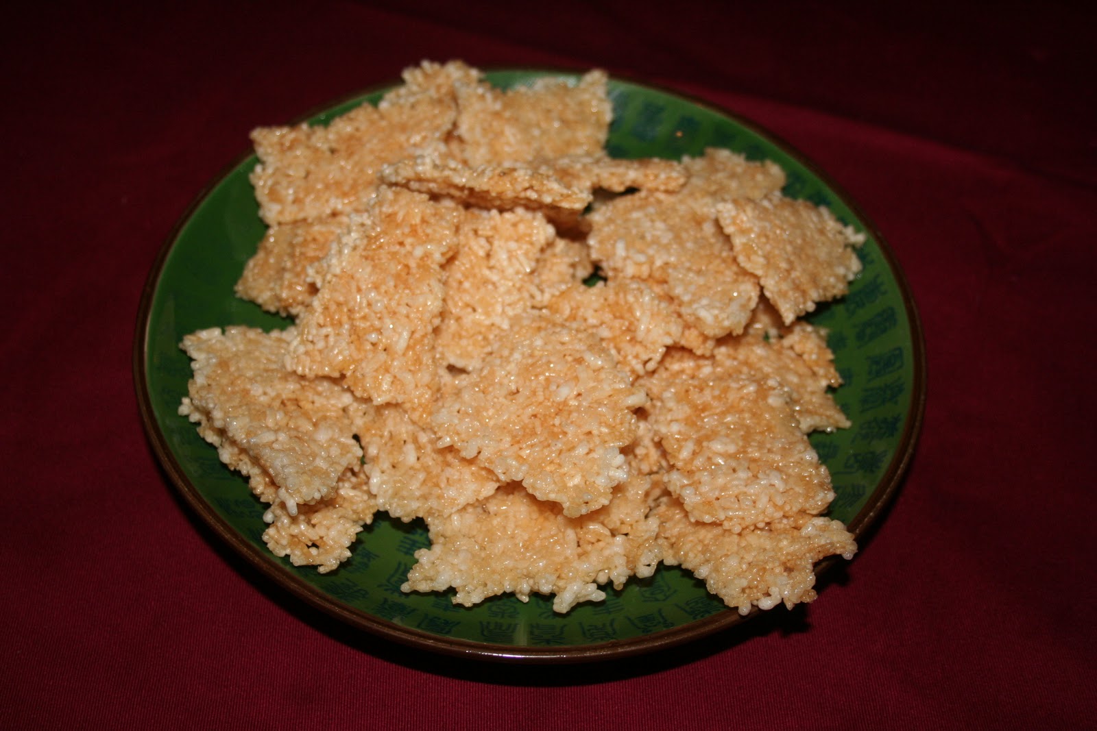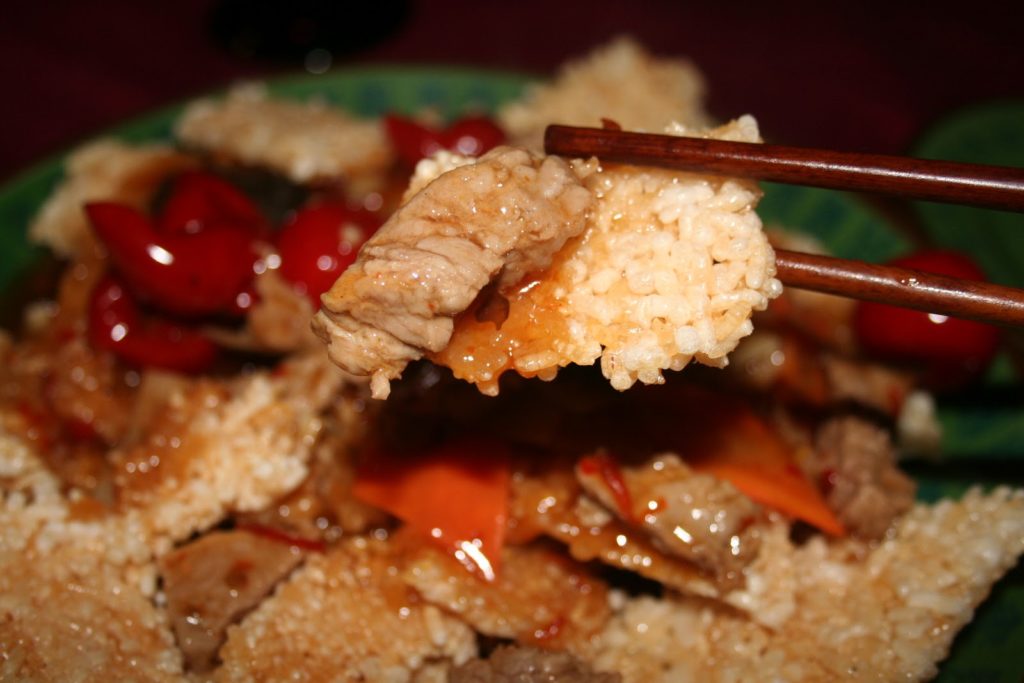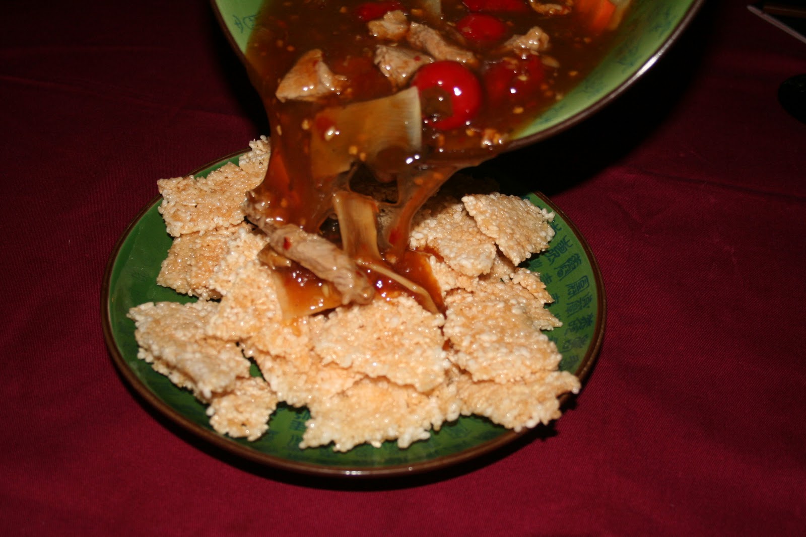 Les galettes de riz sortent de la friture, sont donc très chaudes et on verse dessus la sauce à la viande. Le riz pétille et on sent déjà que l’on va se régaler!!