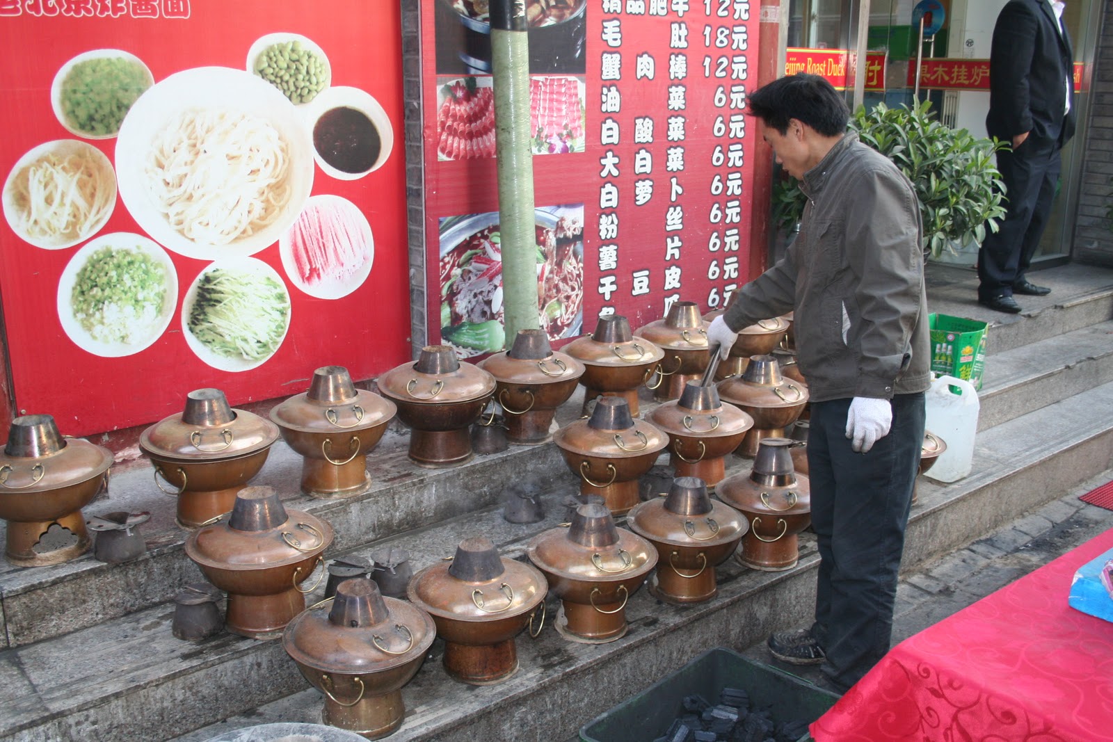 On trouve ici les marmites utilisées pour ce que l’on appelle chez nous « fondues chinoises ». Ce monsieur place à l’intérieur un morceau de charbon ardent afin de chauffer le tout et de faire bouillir le liquide qui cuira les légumes et la viande.