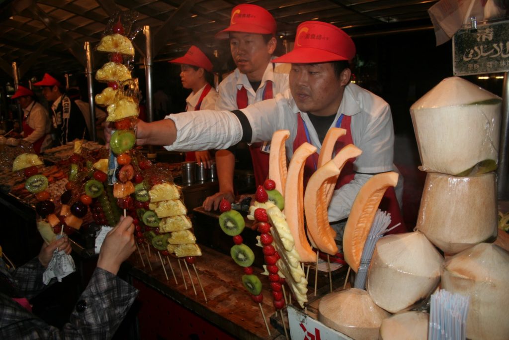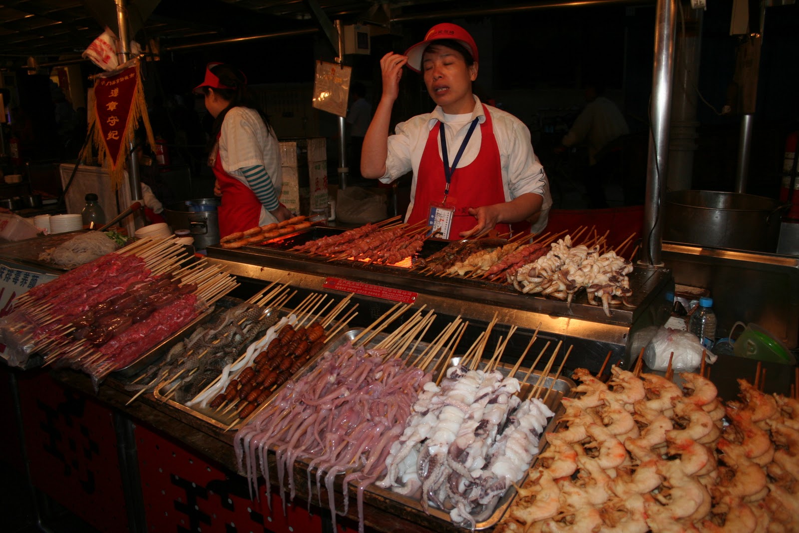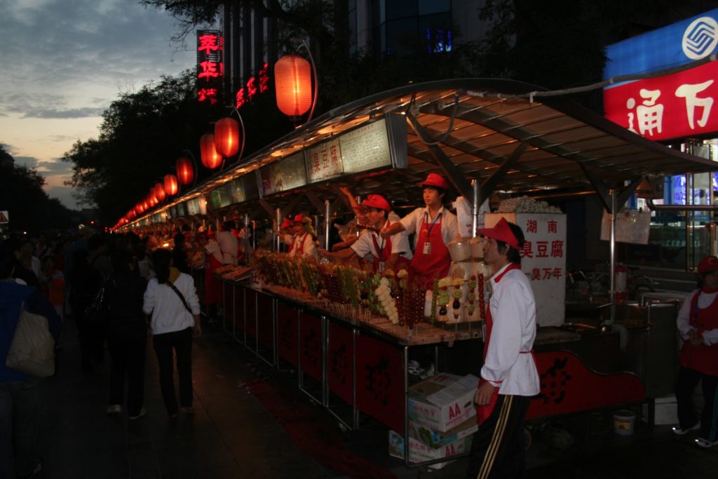 La nuit tombée, il faut aller du côté de la rue Wangfujing, dans une rue perpendiculaire pour trouver le « night food market », autrement dit le marché nocturne de nourriture.