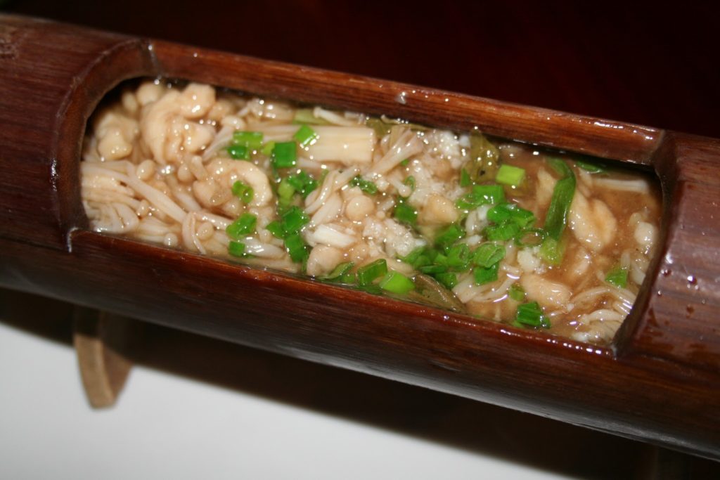 Dans ce morceau de bambou sculpté, est servi un délicieux poulet aux longs champignons dans une sauce à l’ail…
