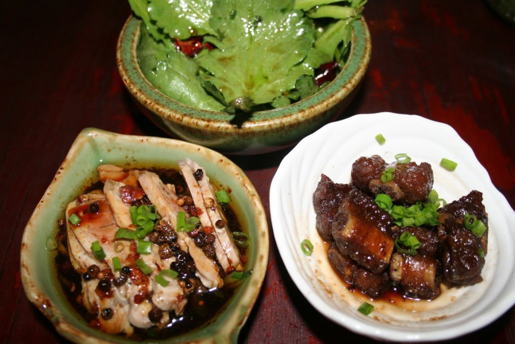 Des amuses-bouches comme ces petits travers de porc caramélisés et un poulet mariné en fines tranches.