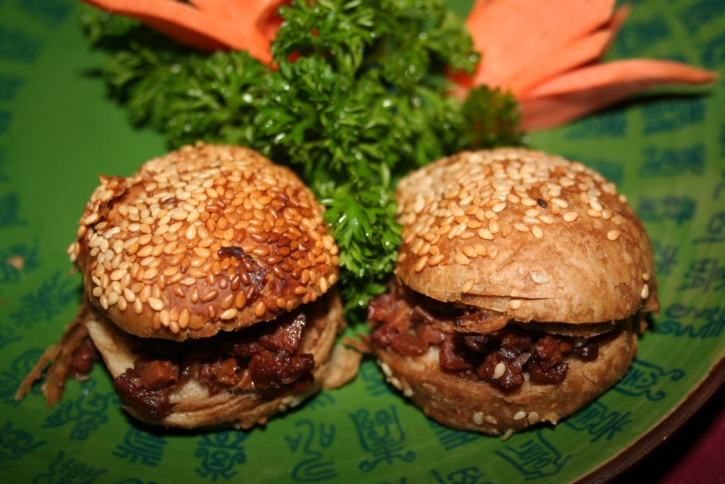 Le porc rouge « char siu » est servi comme d’autres plats, avec un Mao sculpté dans une racine de tarot.