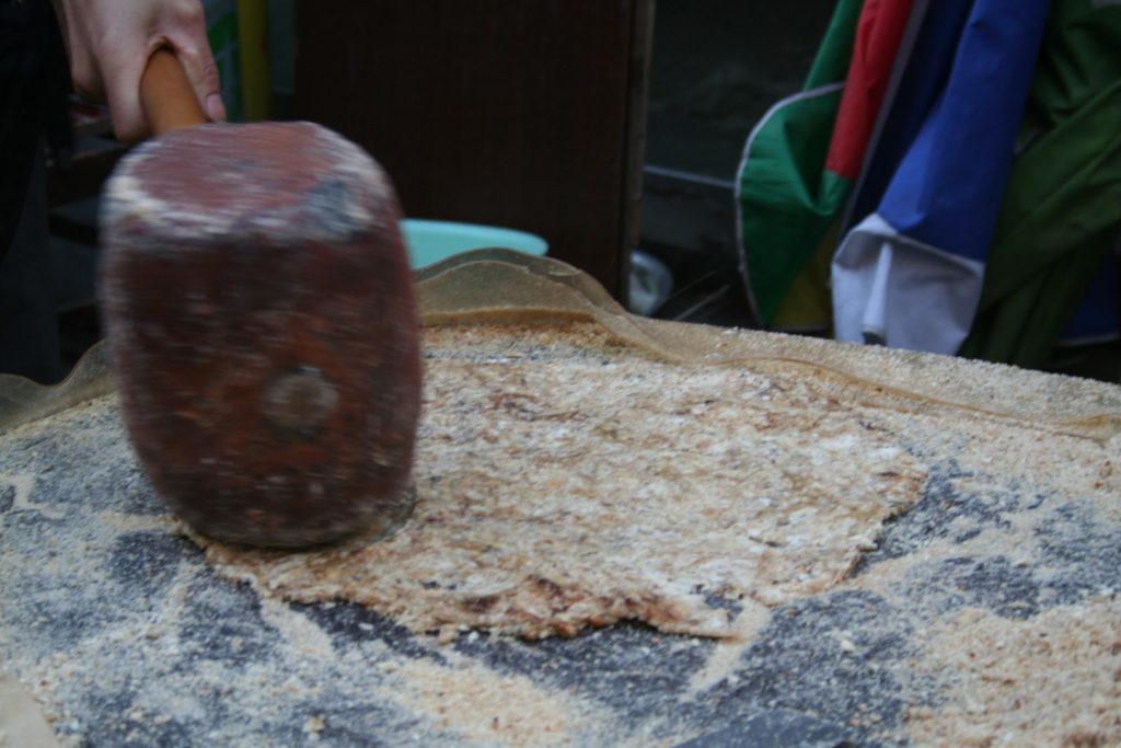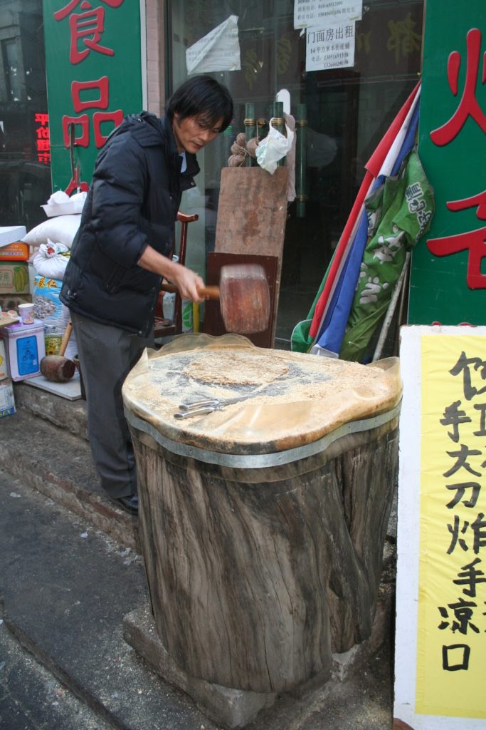 Celui-ci prépare un nougat à base de cacahuètes en le martelant.