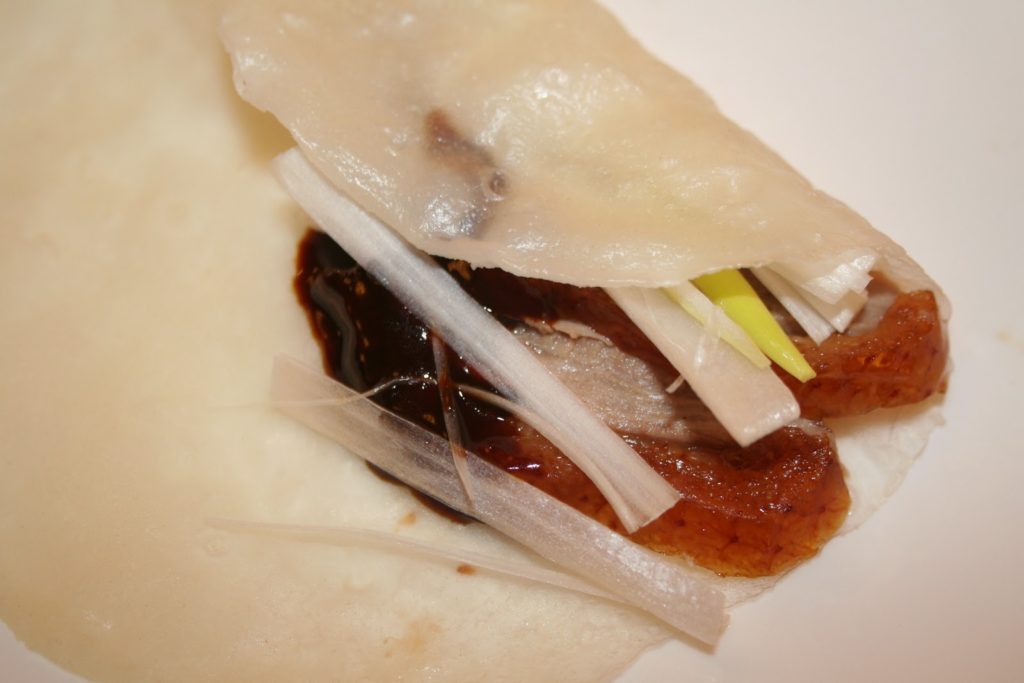 On voit ici le canard avec les crêpes de riz, la sauce et les oignons en lamelles.