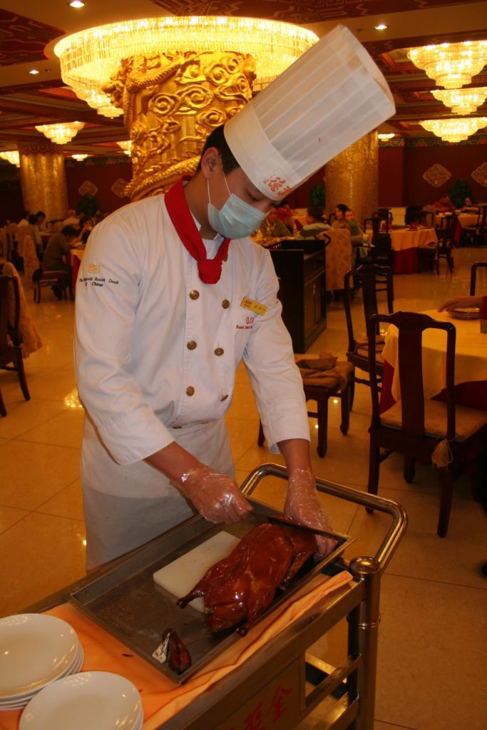 Le canard est ensuite découpé devant le client par un expert! Avec des petits gestes précis et un bon couteau, le chef prélève la peau du canard. Il est bon de rappeler que l’on servait autrefois uniquement la peau du canard sans accompagnement , mais que pour accommoder aux goûts des occidentaux, au début du 20ème siècle, il a ensuite été servi avec des crêpes de riz et une sauce (hoisin) et beaucoup plus de chair.