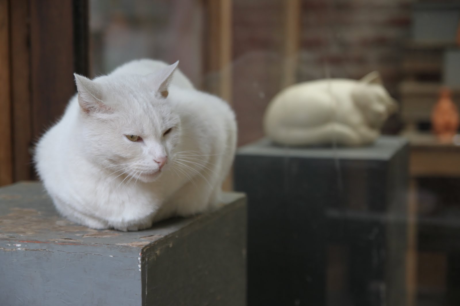 Je mets cette photo car j’aimais bien le contraste entre le vrai chat qui fait sa sieste et la sculpture du chat en pierre au fond.