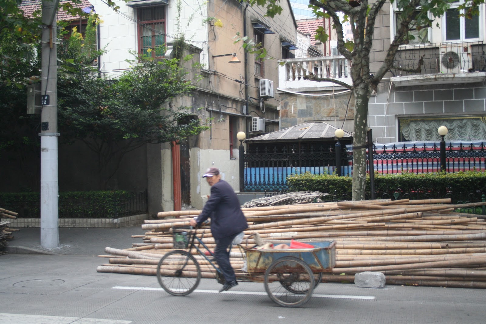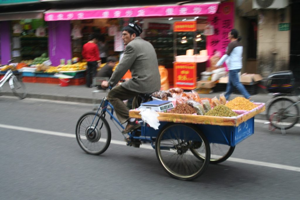 Dans les rues de Shanghai, on trouve encore des vendeurs avec leurs ventes sur leur vélo. Je me suis d’ailleurs précipité pour le suivre…
